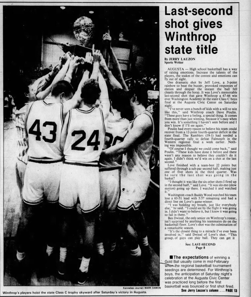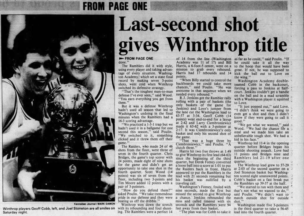 The Winthrop boys basketball team edged Washington Academy 67-66 in the 1992 Class C final at the Augusta Civic Center. The Ramblers trailed by 12 points with just less than six minutes in the game, but stormed back to pull out the victory. A story on the game appeared on the front page of the March 2, 1992 Kennebec Journal.