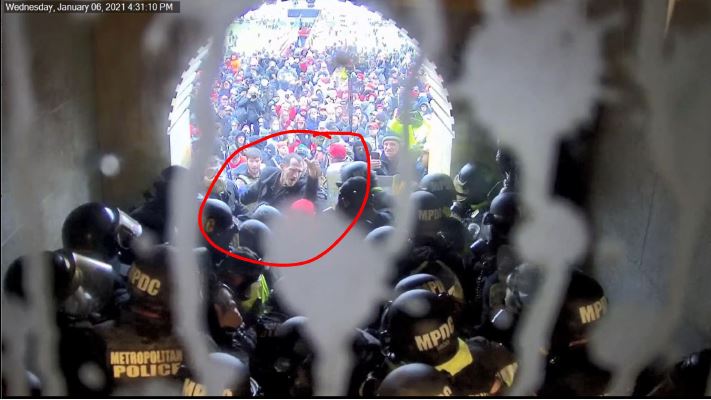 Christopher Maurer is seen gesturing to officers just outside the tunnel on the Lower West Terrace during the Jan. 6, 2021, insurrection at the U.S. Capitol. Courtesy FBI