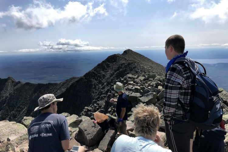Hikers look out over the Knife Edge from Baxter Peak on Mt. Katahdin in 2019. Derek Davis/Staff Photographer