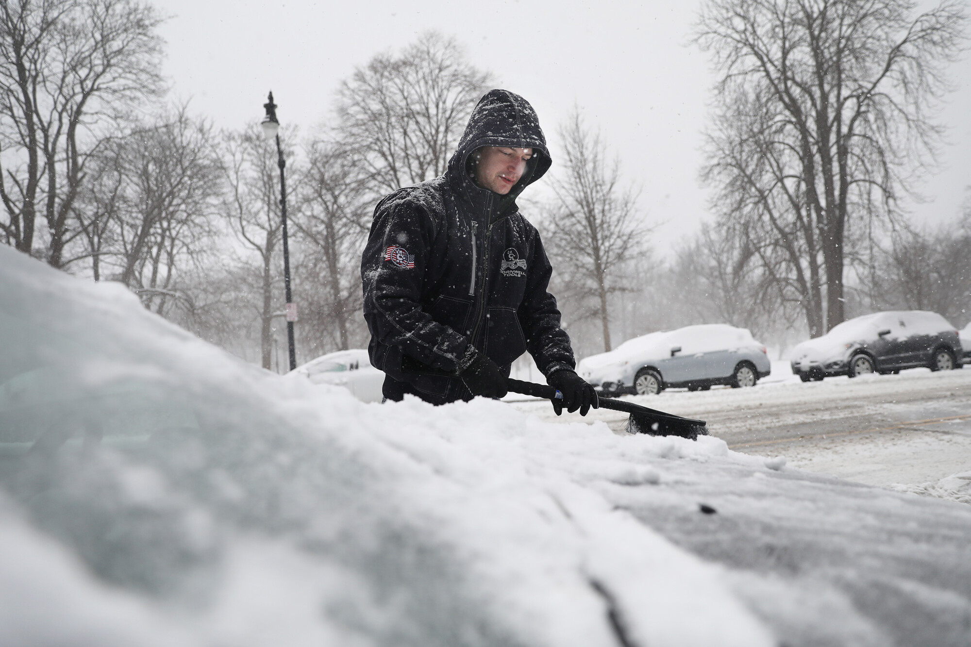 Adam Landry of Portland clears snow off his car while trying to get to work on Thursday morning. Landry, who did not have a shovel, said, “If I can’t get out, then I won’t go in (to work).” Derek Davis/Staff Photographer