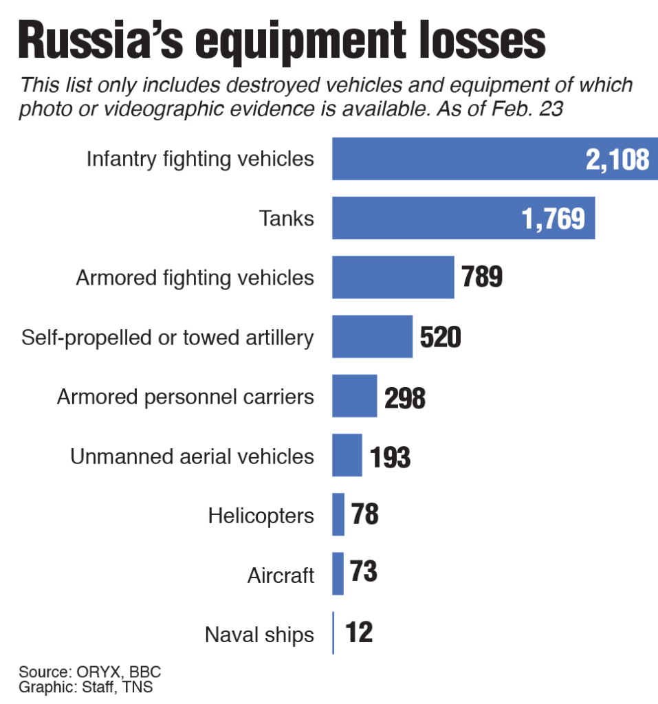 Russia has relied on its massive arsenal, and boosted production of weapons and munitions, giving it a significant edge. While Ukrainian and Western intelligence agencies observed that Moscow is running out of precision missiles, it has plenty of old-style weapons.