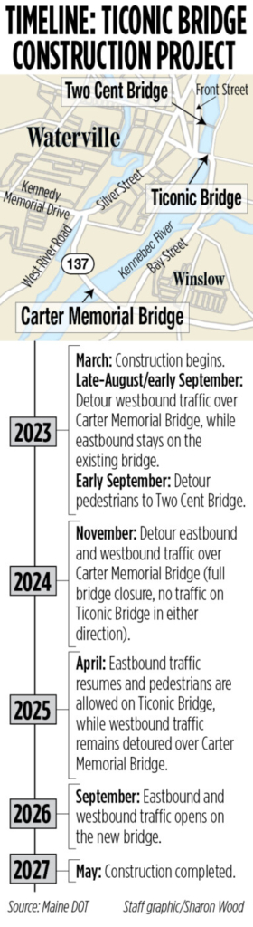 Starting in late August or early September, westbound traffic from Winslow will be detoured to the Carter Memorial Bridge, which is south of the Ticonic Bridge, and eastbound traffic would stay on the Ticonic Bridge, according to a state Department of Transportation schedule. Early in September, pedestrian traffic would then be detoured to the Two Cent Bridge at Head of Falls.