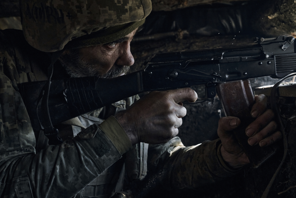 A Ukrainian soldier of the 28th brigade fires on the frontline during a battle with Russian troops at the frontline near Bakhmut, Donetsk region, Ukraine, on Friday. Libkos via Associated Press