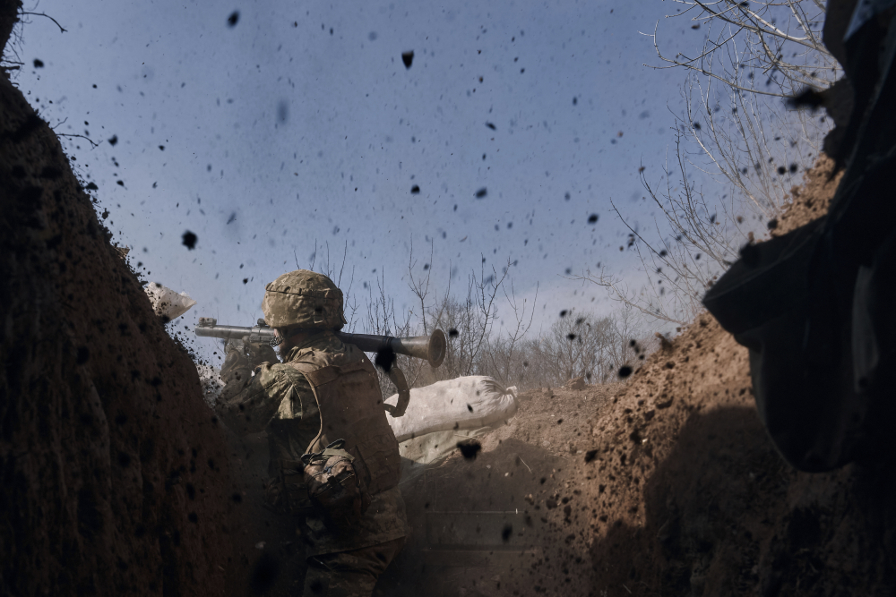 A Ukrainian soldier of the 28th brigade fires a grenade launcher on the frontline during a battle with Russian troops near Bakhmut, Donetsk region, Ukraine on Friday. Libkos via Associated Press