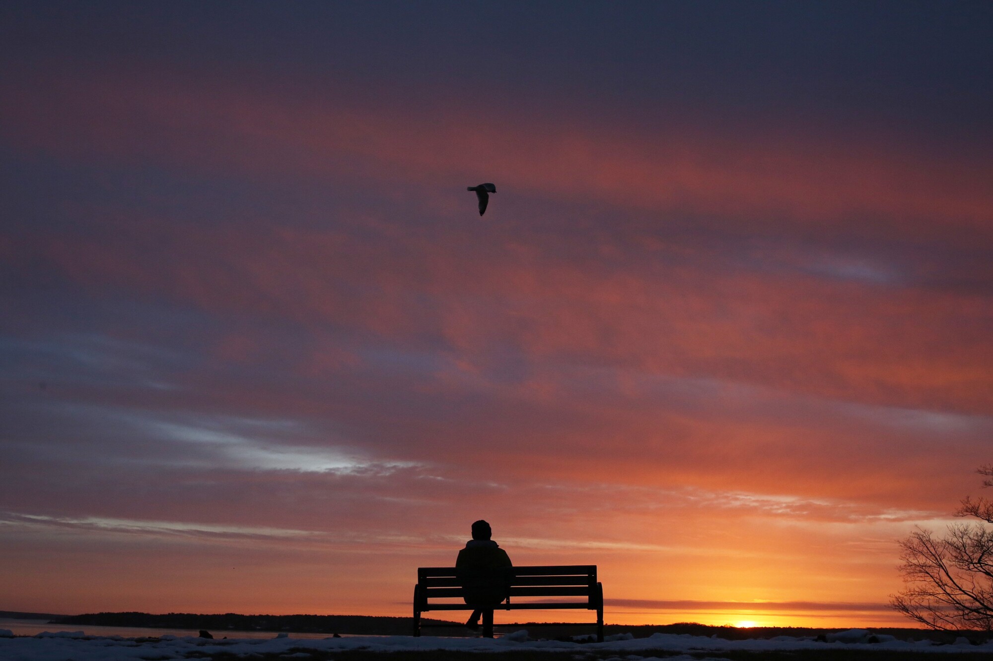 Logan Edwards of Portland takes in the sunrise from a park bench on the Eastern Promenade on March 13. Ben McCanna/Staff Photographer