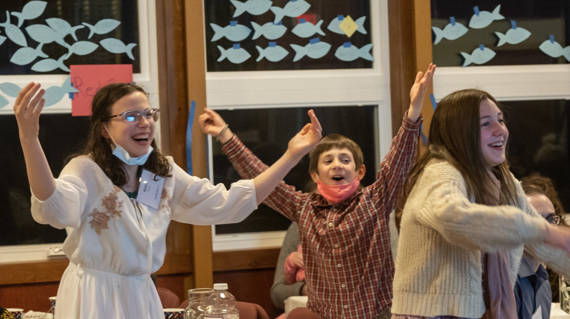 Robin Asch, left, Ori Gagne and Eleanor Gagne stand up and gesture Thursday, April 6, as they participate in a group sing-along during a community Seder at Temple Beth El in Augusta. The Seder is a traditional Passover meal that commemorates the liberation of ancient Jews from slavery in Egypt and includes telling the story of their exodus, drinking four cups of wine or grape juice, eating symbolic foods, singing and other traditions. It was the first in-person Passover event at the temple since the coronavirus pandemic hit in 2020. Joe Phelan/Kennebec Journal