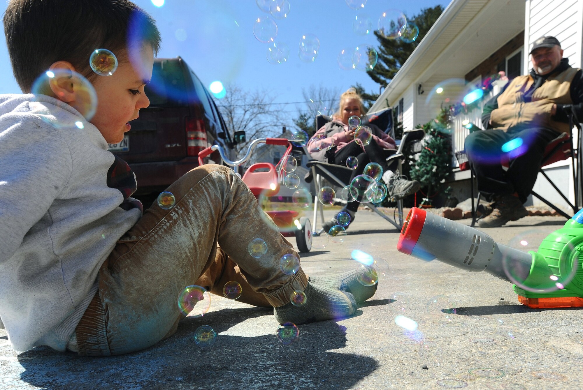 Brody Lower, 3, is surrounded by soap bubbles while sitting by a battery operated bubble machine in the driveway of his family’s home in Winslow on Sunday, April 9. The boy, who is pictured with his grandparents, Julie and Shane Morrison, also rode his tricycle and drew with chalk while enjoying the sunshine. The boy’s father, Garrett Lower, said he was using a gallon container of soap solution to keep the bubble machine full. Rich Abrahamson/Morning Sentinel