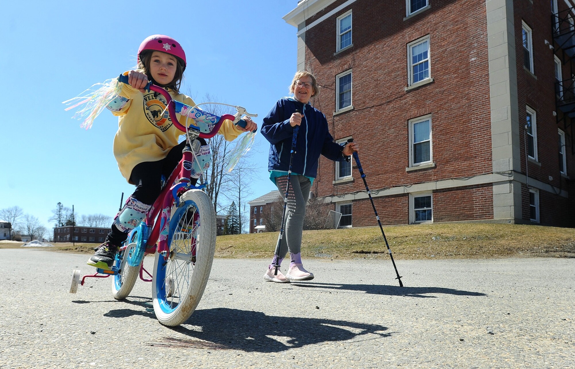 Autumn Thurston, 6, pedals her bicycle Sunday, April 9, at the Maine Central Institute campus in Pittsfield, as her grandmother, Christine Kett, walks alongside. Autumn says this is her first time riding her bike this year. She is learning to ride with training wheels while navigating hills, with assistance from her grandmother. Rich Abrahamson/Morning Sentinel
