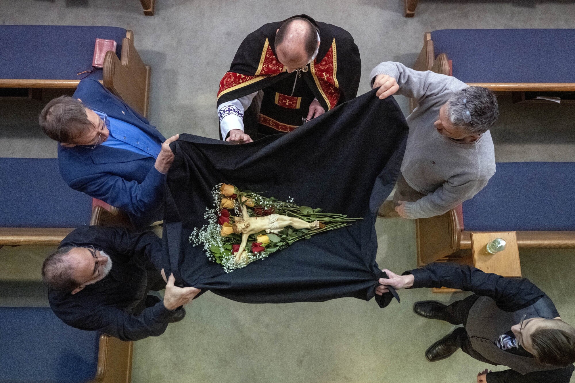 The Rev. James Doran, center, guides the shrouded statue of Christ during a Good Friday service at Saint Joseph Maronite Catholic Church in Waterville. The service on Friday, April 7, was part of the church’s Holy Week observances leading up to Easter Sunday. Michael G. Seamans/Morning Sentinel