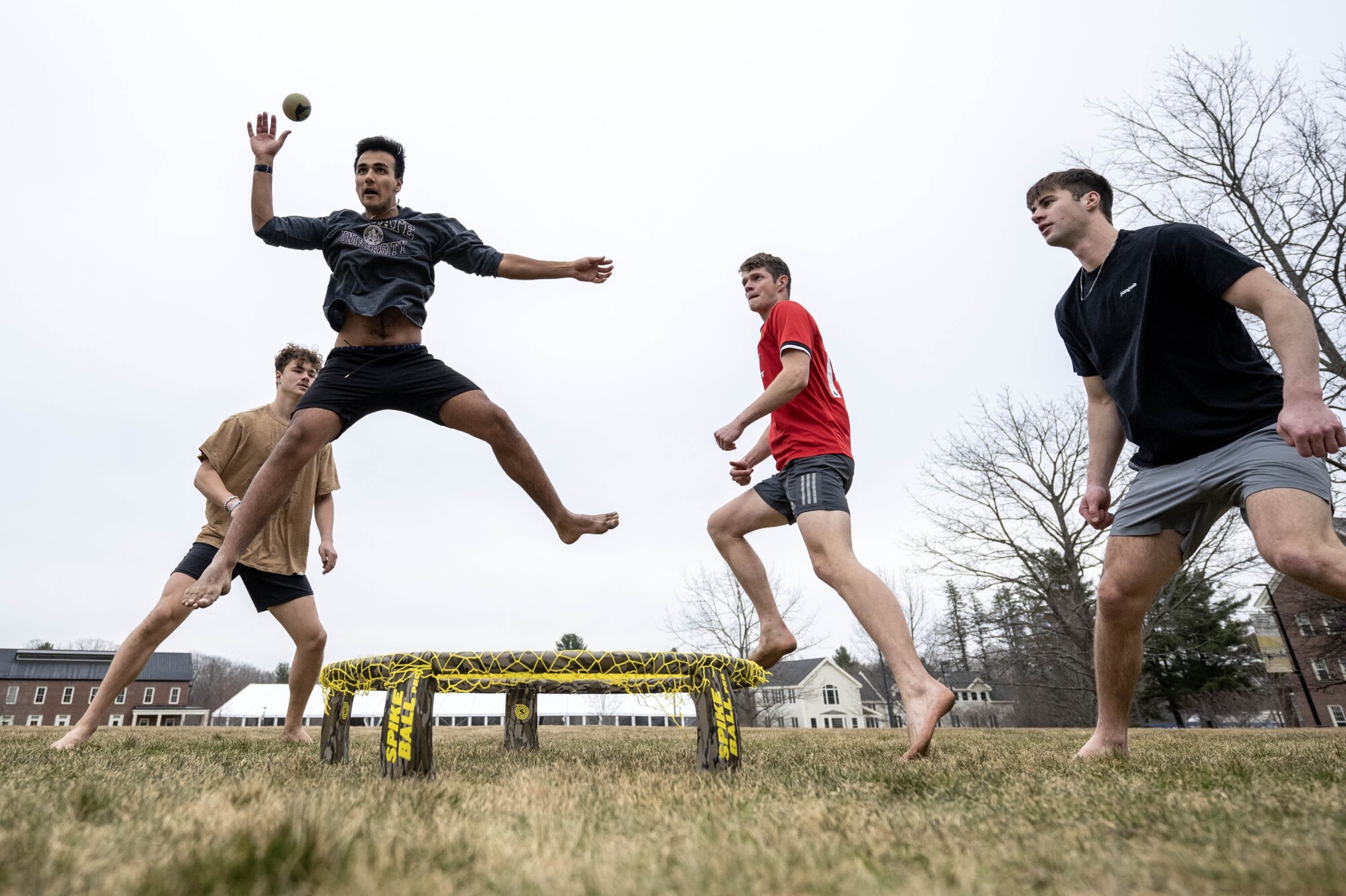 Colby College freshman Marc Hiranadani jumps in the air to spike the ball Tuesday during a game of spike ball with classmates Simon Di Matteo, back left, Liam Carcich, right center, and Tait Kline at Colby in Waterville. Michael G. Seamans/Morning Sentinel