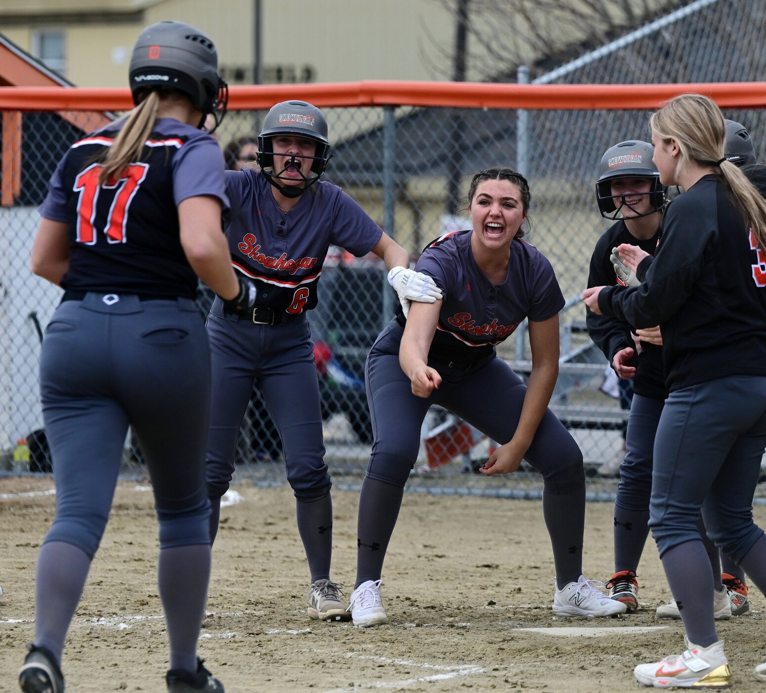 Skowhegan’s Callaway LePage, left, is greeted at home plate by teammates after LePage clubbed a homer to left field during a preseason softball game Tuesday against in Skowhegan. Rich Abrahamson/Morning Sentinel