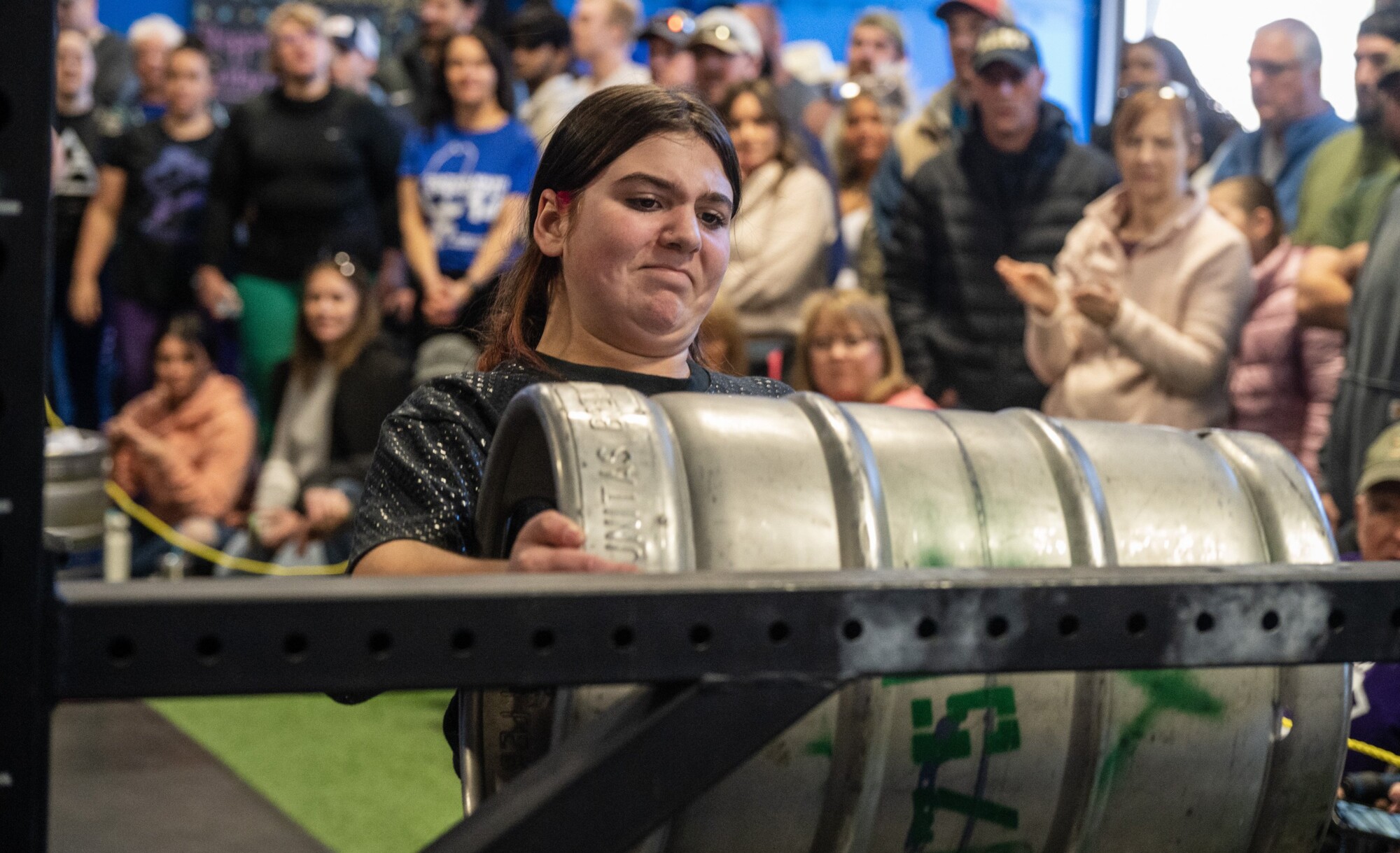 Abbie Wilson, of Randolph, hoists a keg over a bar during the Central Maine Strongman 14 on Saturday, April 8, at GEvolution in Augusta. Joe Phelan/Kennebec Journal
