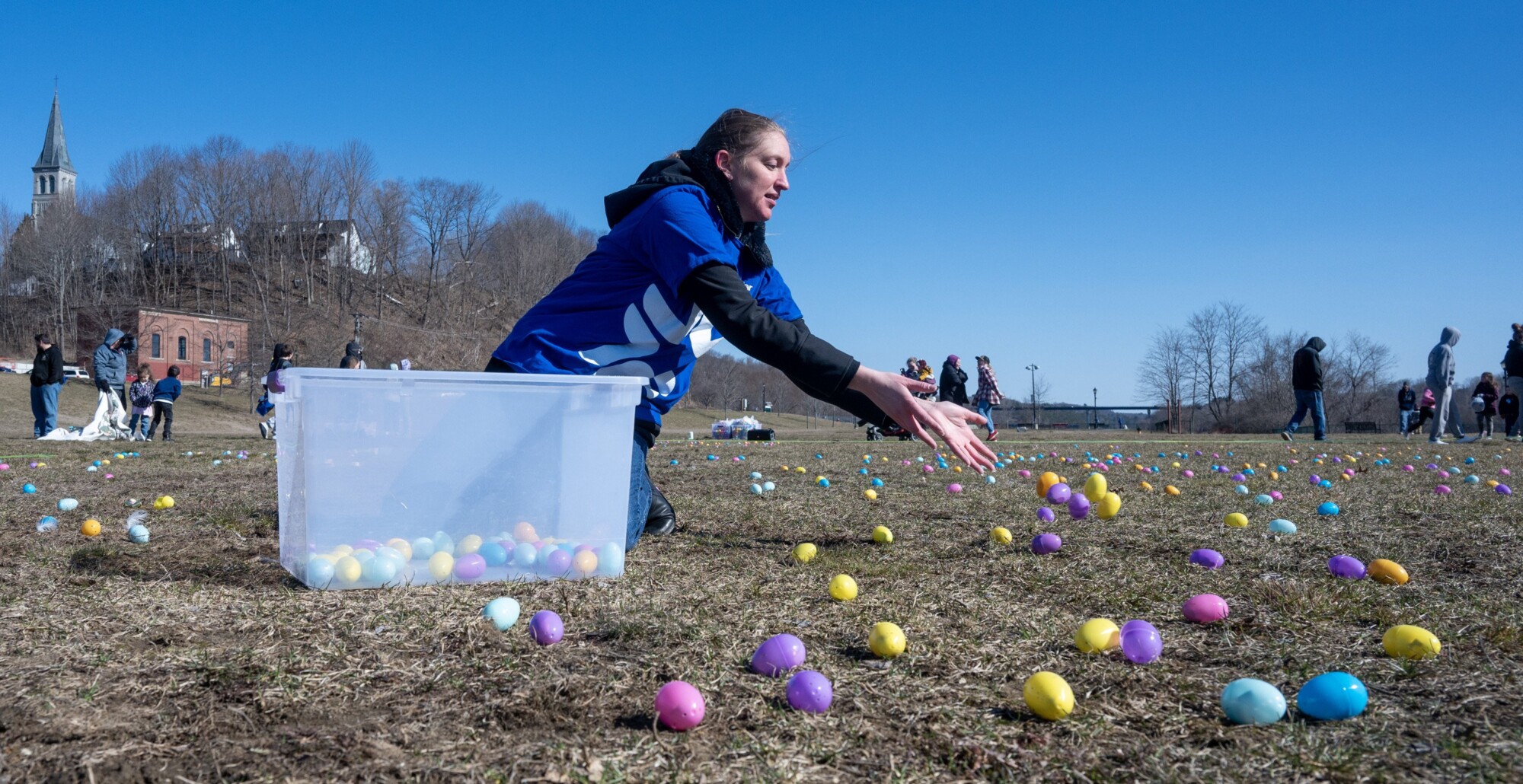Jen Price tosses more eggs out onto the ground Saturday, April 8, as she and other volunteers reset for another round of Easter egg hunting at Mill Park in Augusta. Joe Phelan/Kennebec Journal