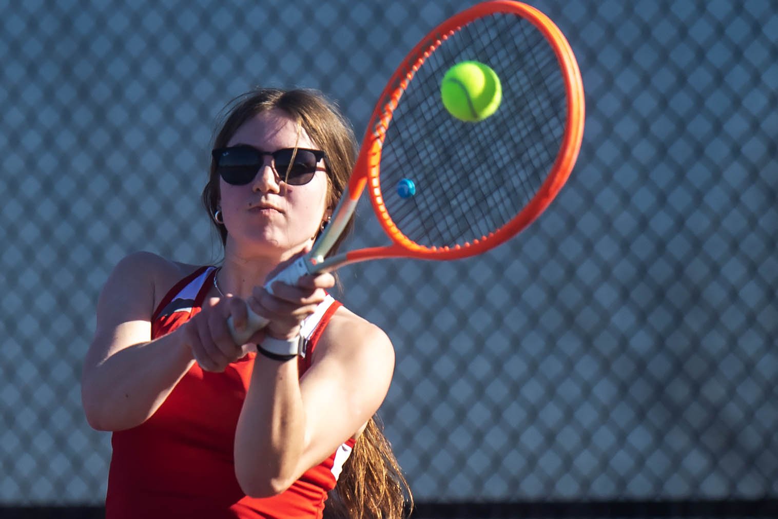 Messalonskee’s Heidi Quist returns s shot to Mt. Blue’s Tessa Marcotte during a girls tennis match Thursday in Oakland. Michael G. Seamans/Morning Sentinel