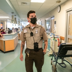 A hospital-trained security officer makes his rounds in 2022, at St. Mary’s Regional Medical Center in Lewiston. He is a hospital-trained security officer ready in case a “Code Gray” is called, which is triggered by violence or potentially dangerous behavior from patients or visitors. Andree Kehn/Sun Journal