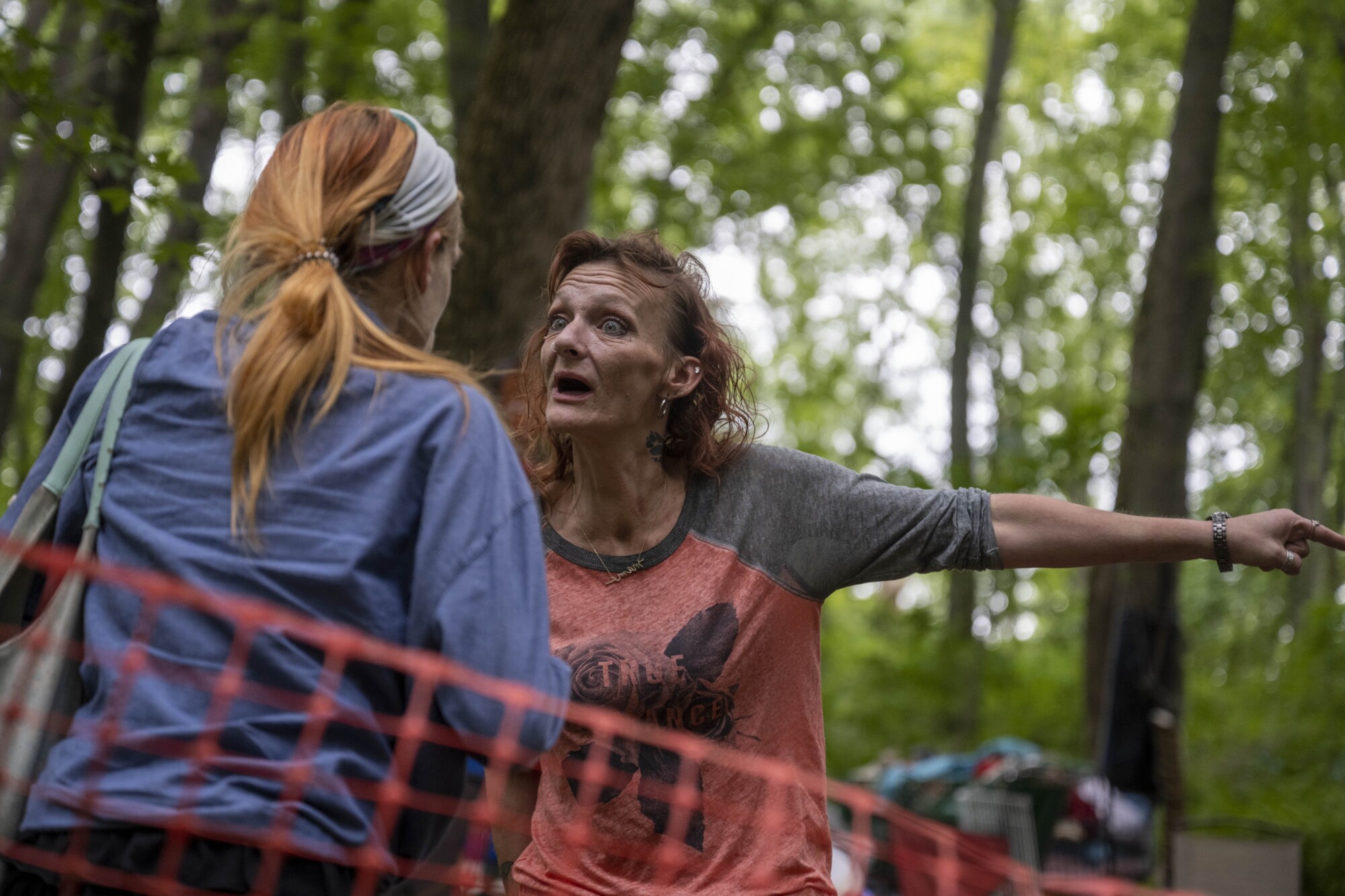 Sarah Juliano, facing, argues with Sarah Wallingford during a dispute about missing drugs at the homeless encampment they shared in the South End of Waterville on Aug. 26, 2022.