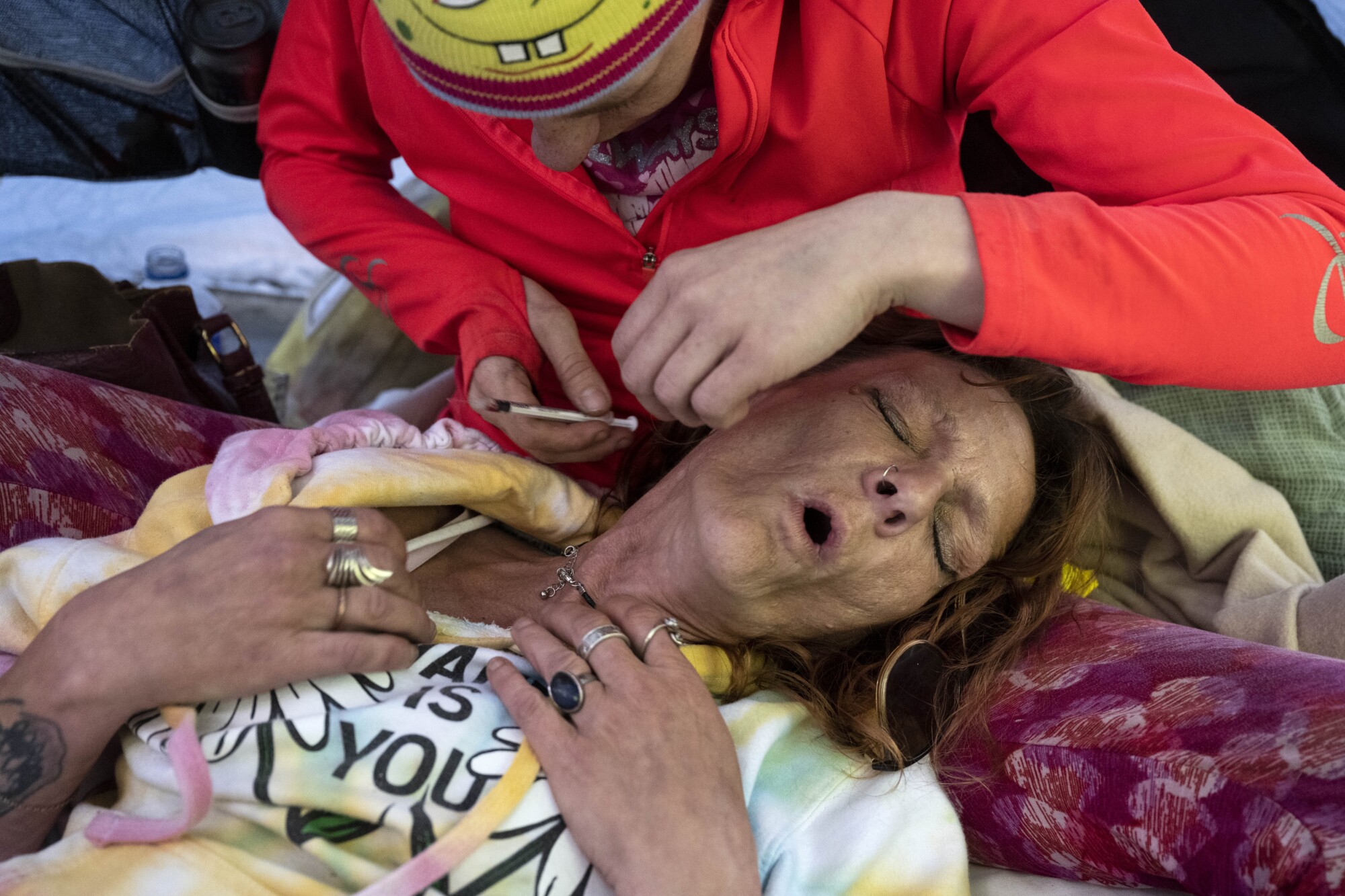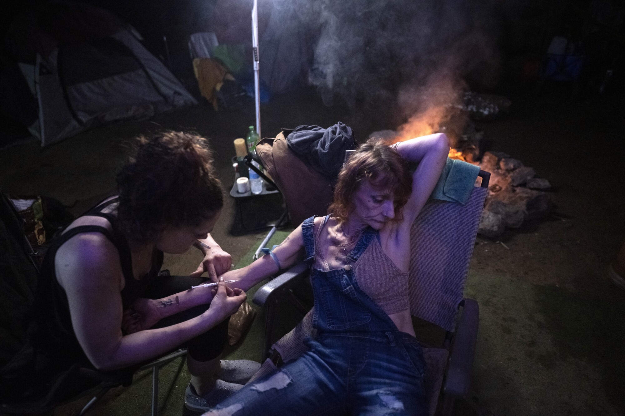 Amanda Frasier assists Sarah Juliano with an injection of heroin and fentanyl while living at a homeless encampment in Waterville on Sept. 12, 2022.
