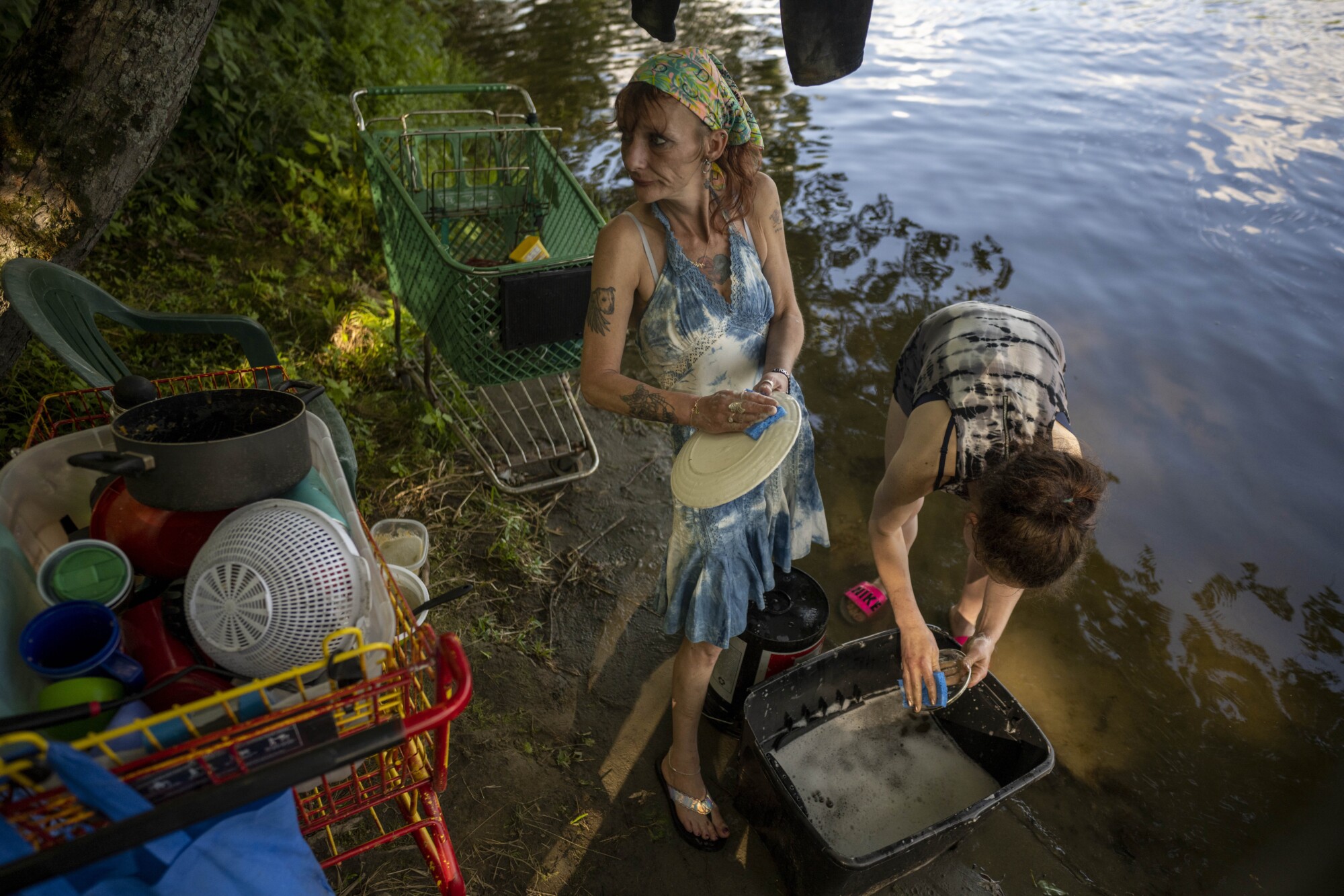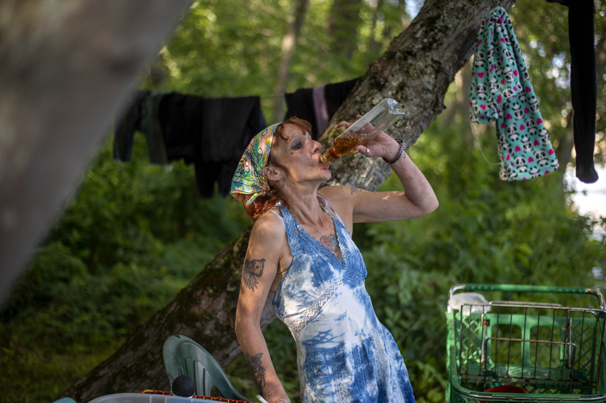Sarah Juliano takes drink from the whiskey bottle as she washes dishes in the river on Aug. 28, 2022.
