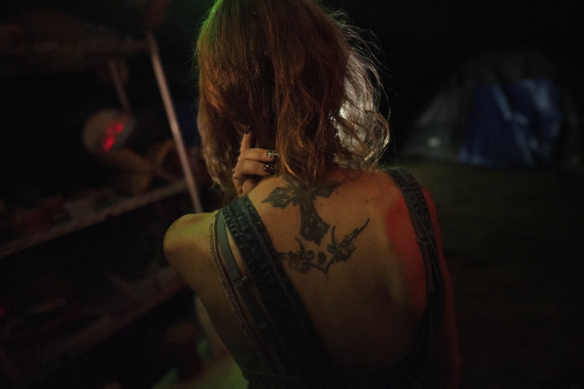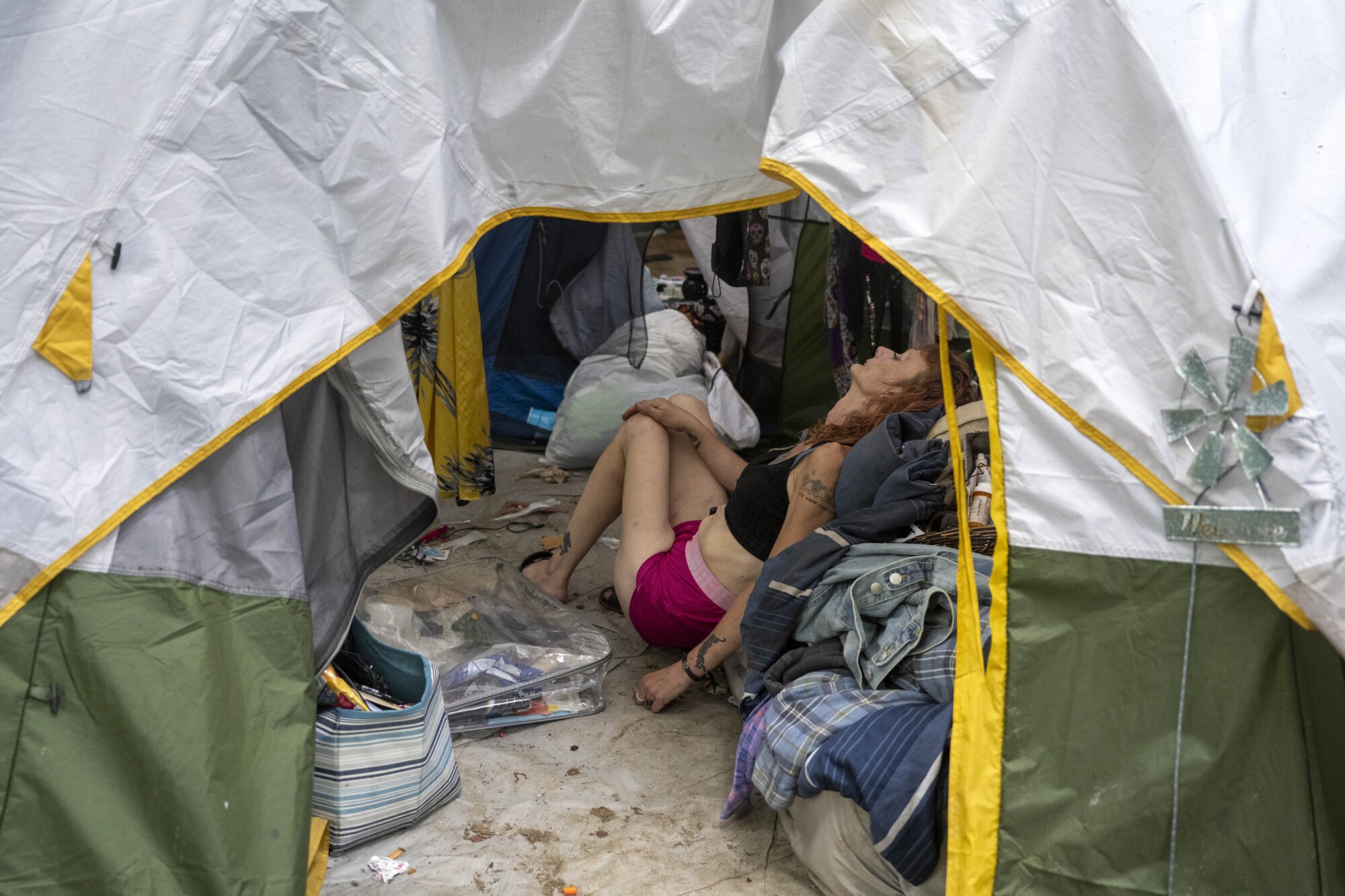 Sarah Juliano sleeps off her high after shooting up a mixture of heroin and fentanyl at the homeless encampment on the Kennebec trail on the island located in a wetland along the Kennebec River in the South End of Waterville on Sept. 11, 2022.