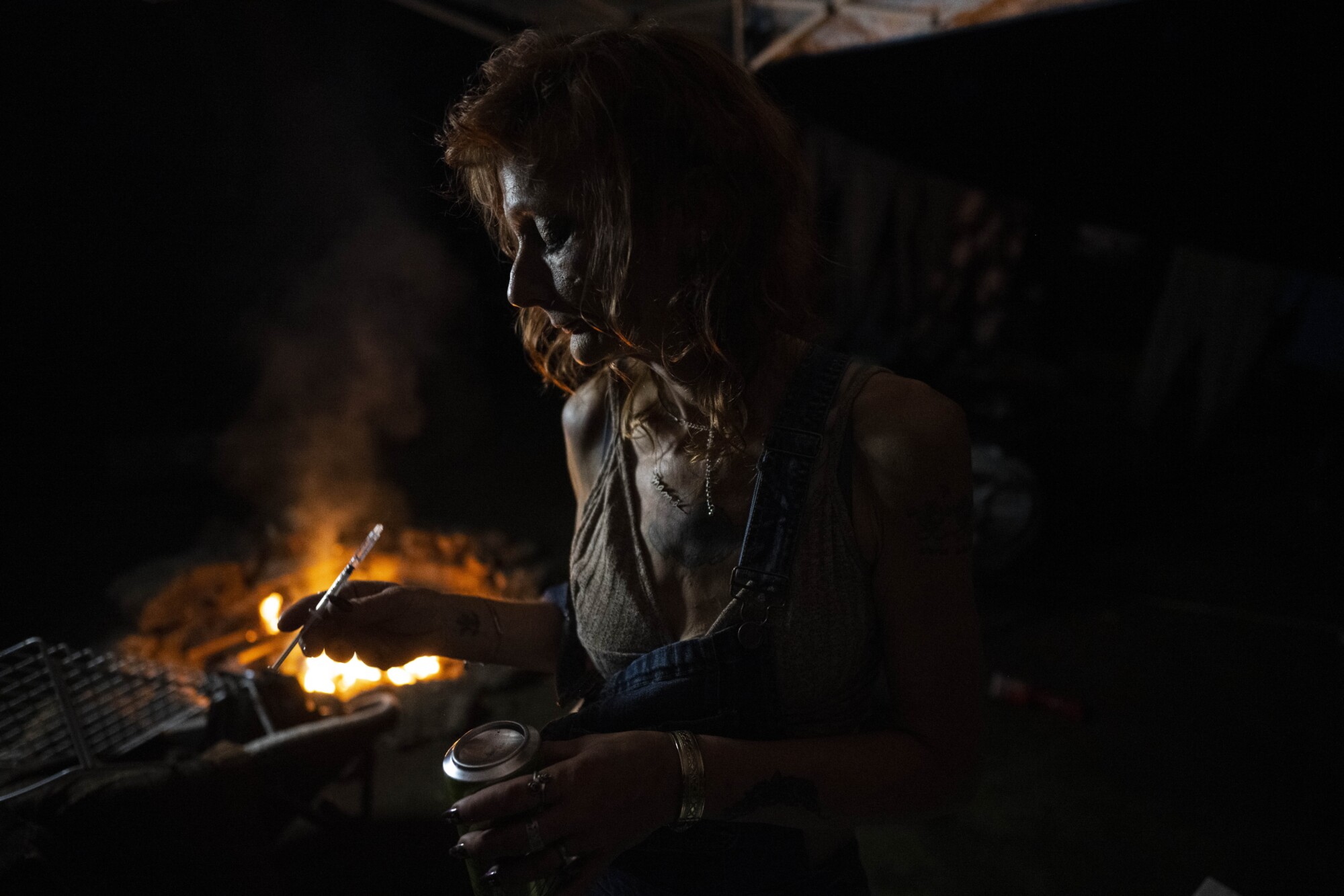 Sarah Juliano holds a syringe loaded with heroin and fentanyl as a camp fire illuminates the campsite she called home along the Kennebec River in Waterville on Sept. 12, 2022.