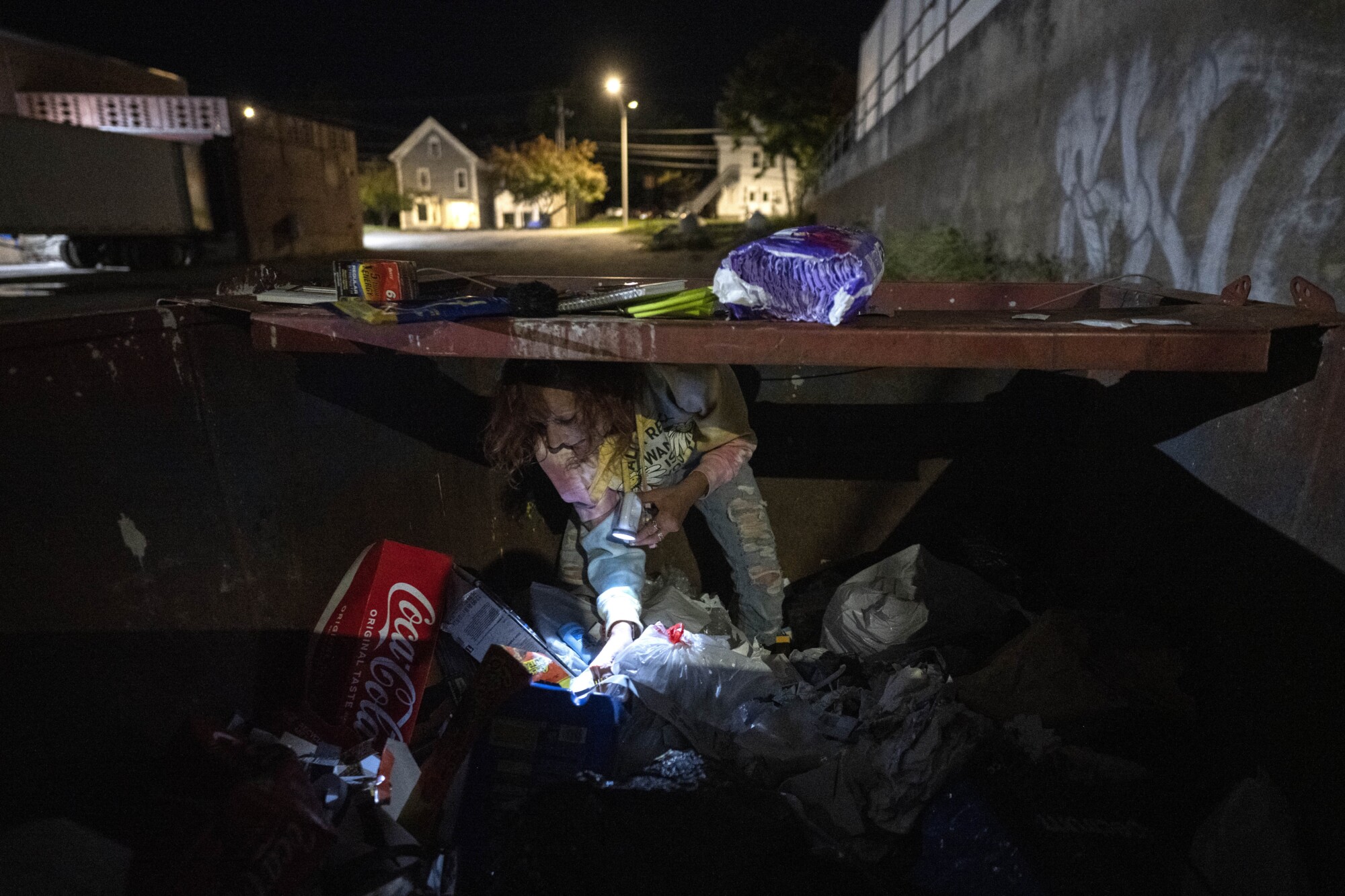 Sarah Juliano rummages through a Dumpster in Waterville on Sept. 14, 2022.