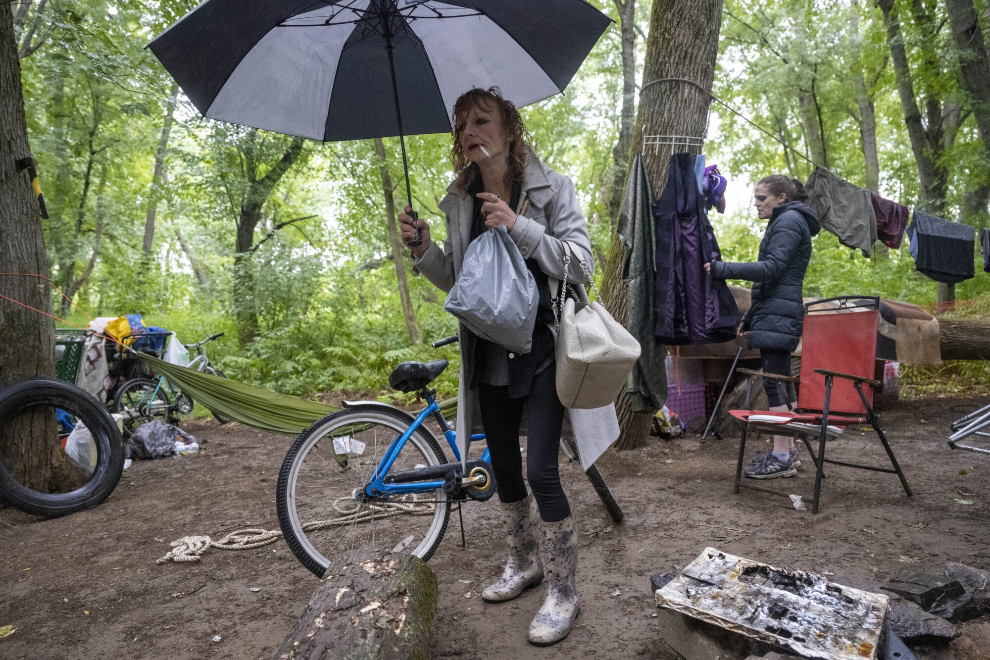 Sarah Juliano stands under the protection of her umbrella as she waits for another member of the homeless encampment on an island in the South End of Waterville on Sept. 6, 2022. Juliano and her new friend, Amanda Frasier, back right, were going to visit an assortment of Dumpsters and donation bins as it rained. At the time, they were both homeless and addicted to heroin and fentanyl.