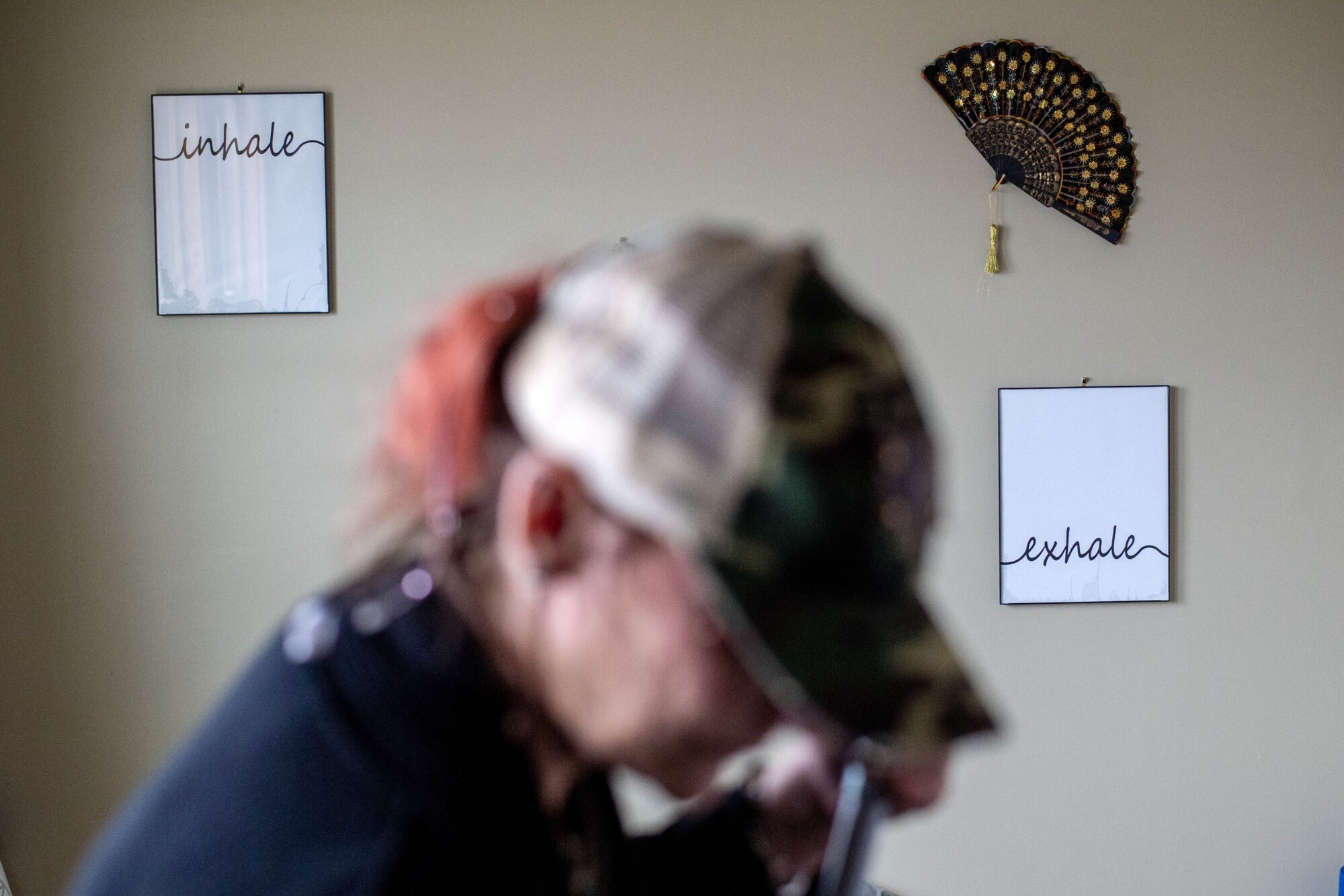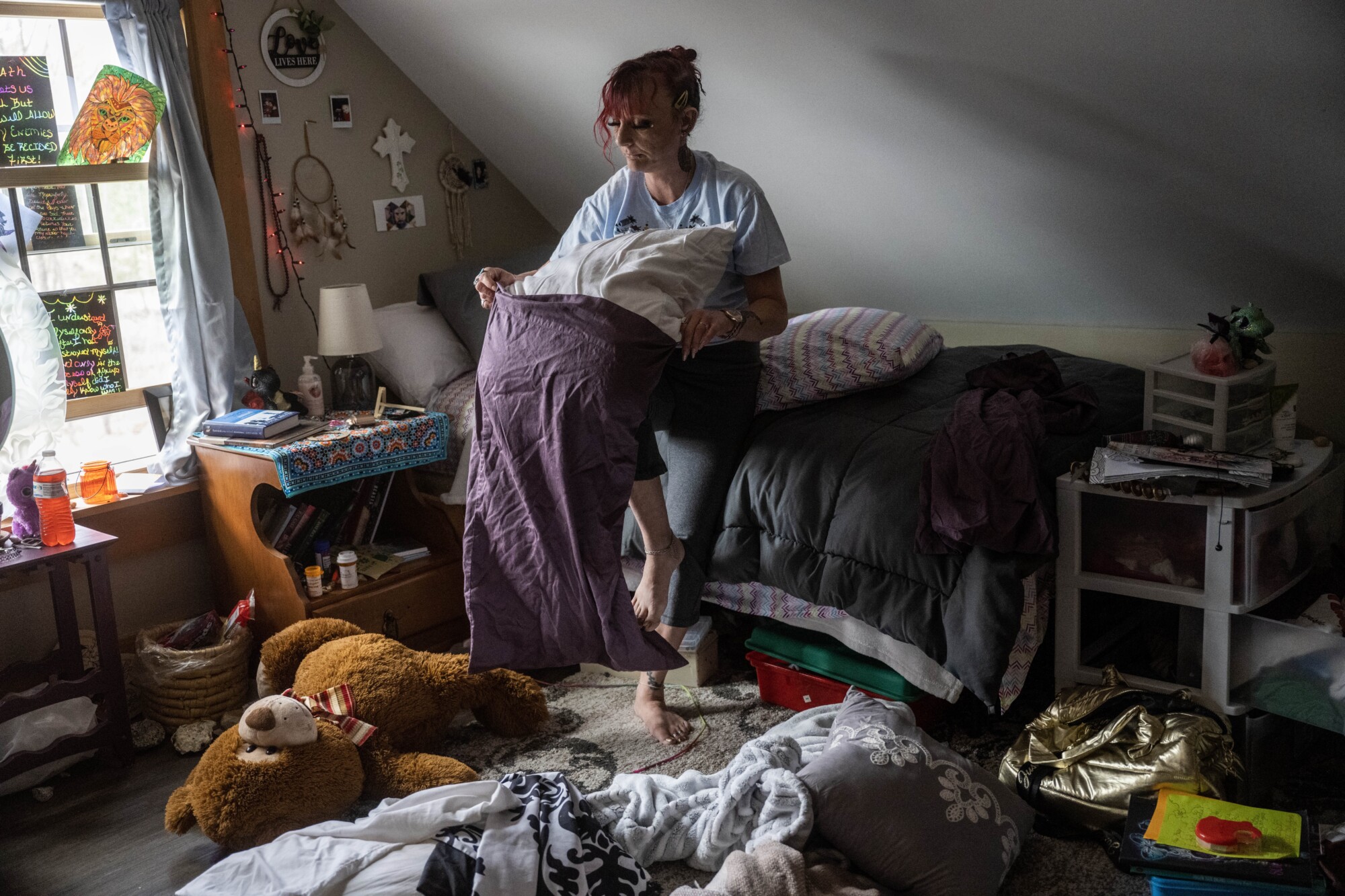 Sarah Juliano sits at her bed at the Mid-Maine Homeless Shelter in Waterville on Tuesday, Oct. 4, 2022. Juliano had been at the shelter for nearly two weeks since overdosing. Since moving into the shelter, she also entered a drug detox program and was seven days sober at the time.