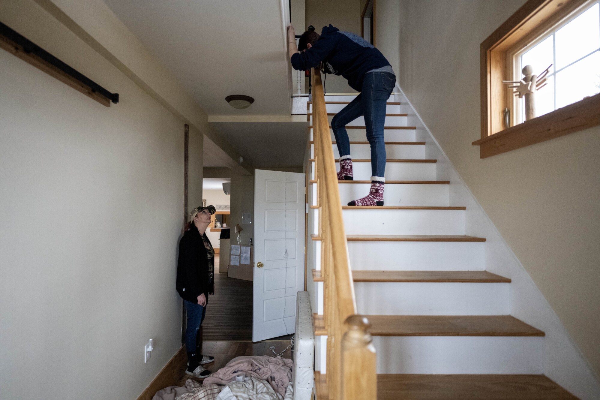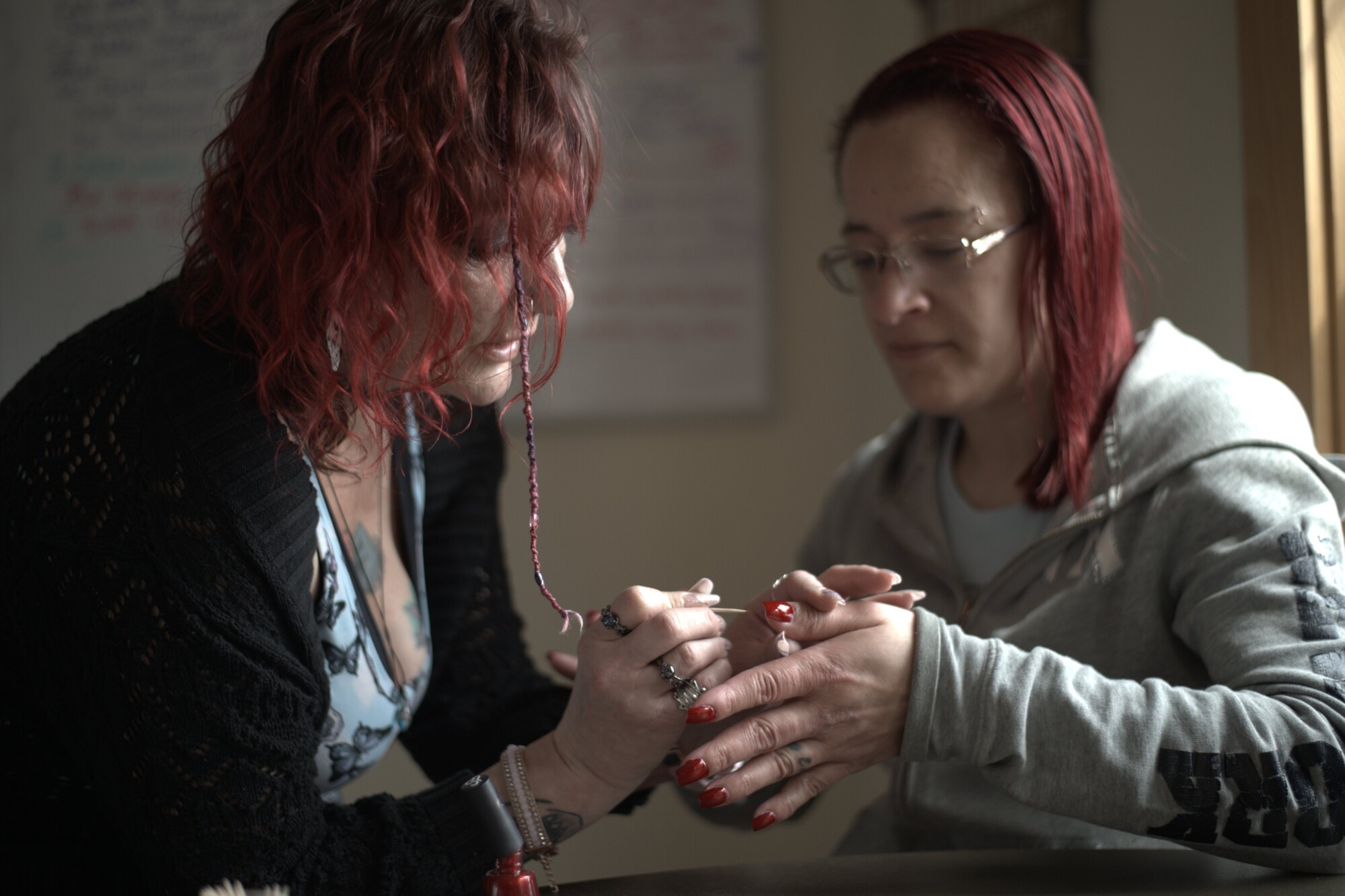 Sarah Juliano is seen with her housemate Brooke at Cory’s House, a sober living home for women recovering from addiction and homelessness, on Sunday, April 16.