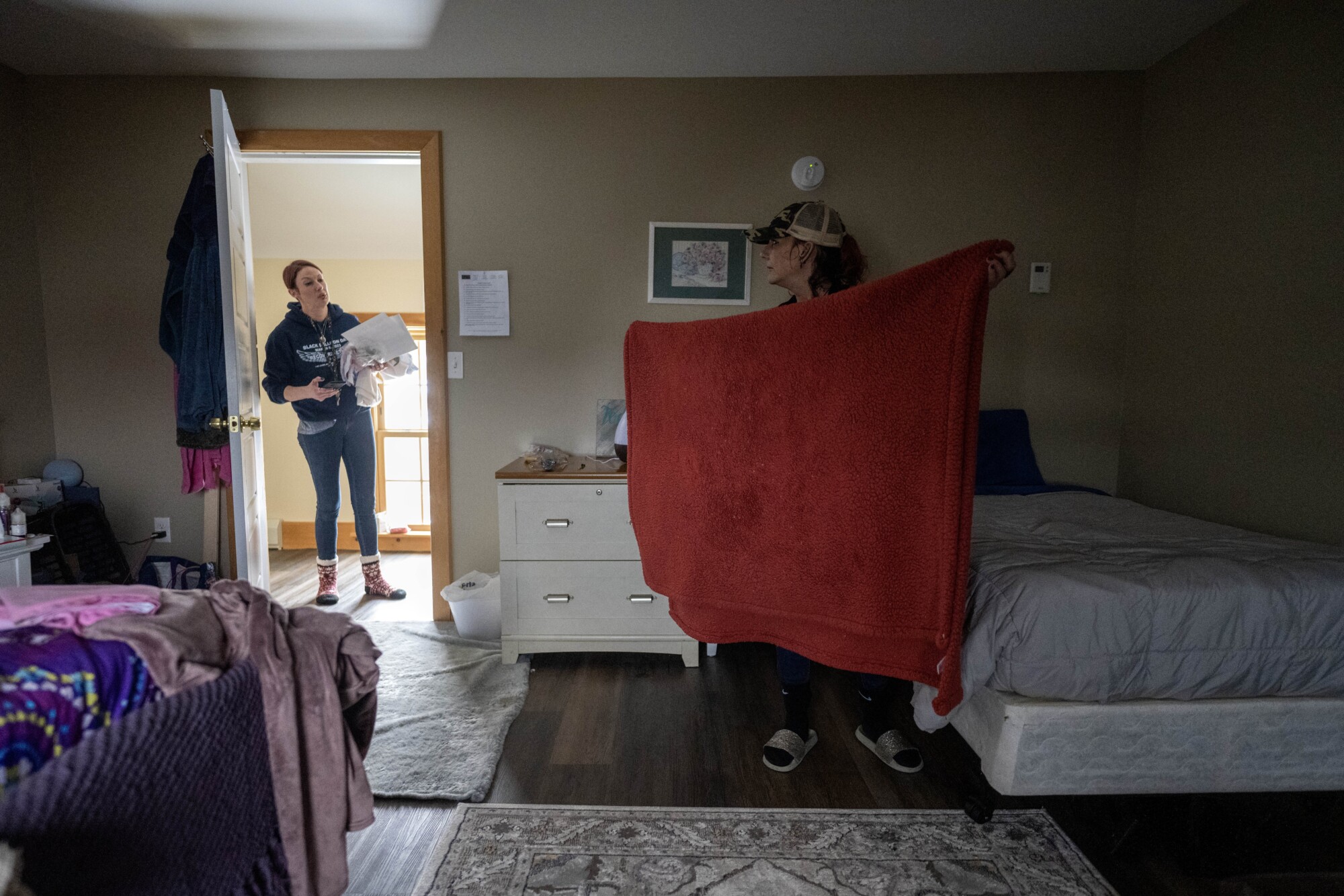 Katie Cushing, left, house manager at Cory’s House, a sober living facility for recovering addicts in Winthrop, and Sarah Juliano, a resident, prepare a bedroom for a new arrival on Saturday, April 1.