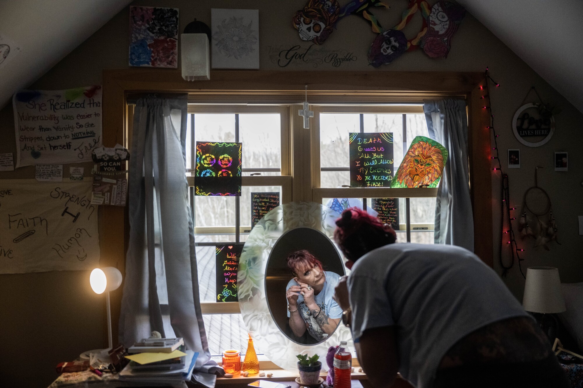 Sarah Juliano puts on some jewelry as she looks in the mirror in her room on the third floor of Cory’s House, a sober living home for recovering addicts in Winthrop on Sunday, April 16.