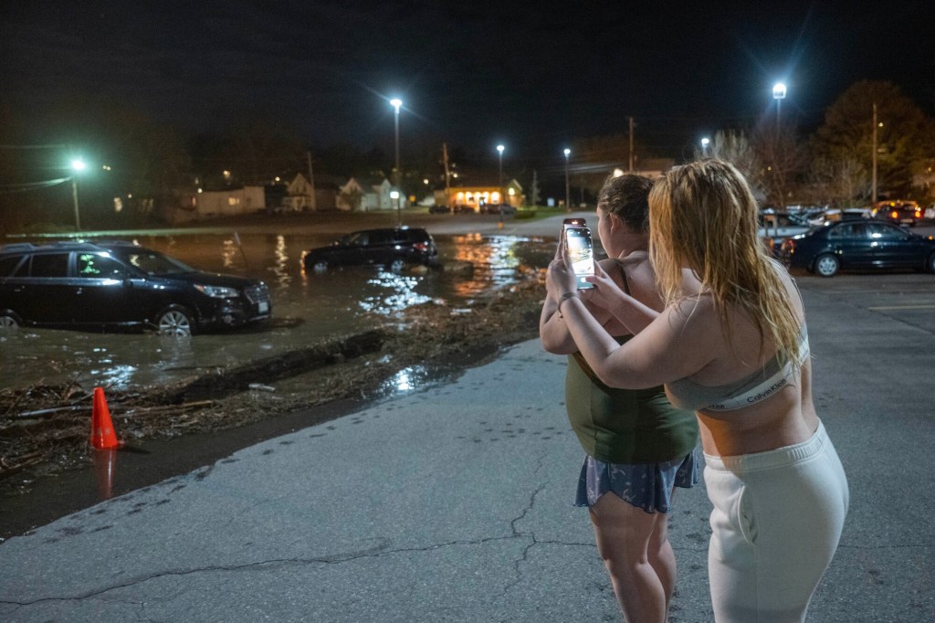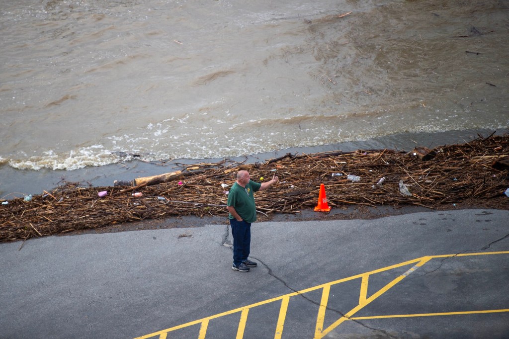 In downtown Waterville, the Hathaway Creative Center parking lot was inundated with water. The flood had carried many large logs and debris into the lot by Tuesday morning, and attracted a handful of onlookers. People took photos and marveled at the flood, many comparing it to the flood of 1987.