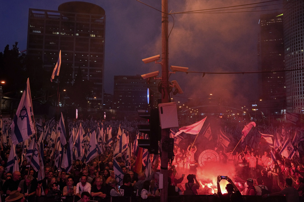 Israelis protest against plans by Prime Minister Benjamin Netanyahu’s government to overhaul the judicial system in Tel Aviv on Saturday. Ariel Schalit/Associated Press