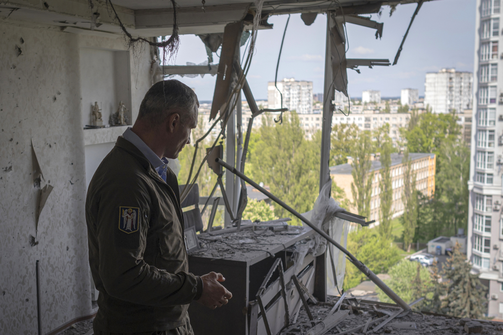 Kyiv Mayor Vitali Klitschko stands in an apartment building damaged by a drone that was shot down during a Russian overnight strike in Kyiv, Ukraine, on Monday. Andrew Kravchenko/Associated Press