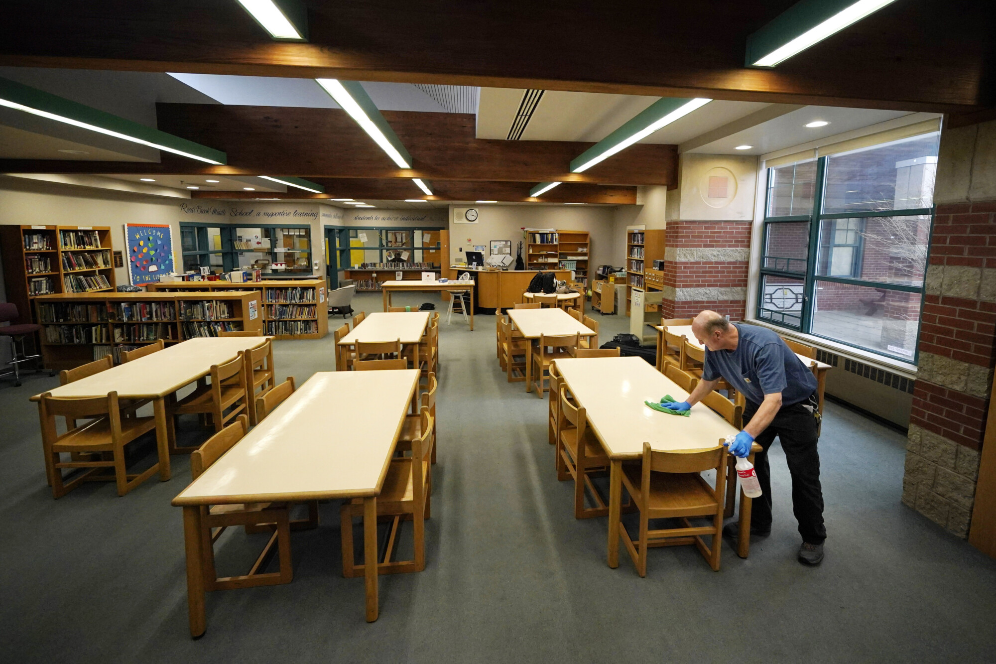 Custodian David Bishop cleans pencil marks from desks in the Hampden Academy library. In addition to his custodial duties, Bishop also serves as the chess coach for the district’s nationally recognized middle school chess team. Robert F. Bukaty/Associated Press