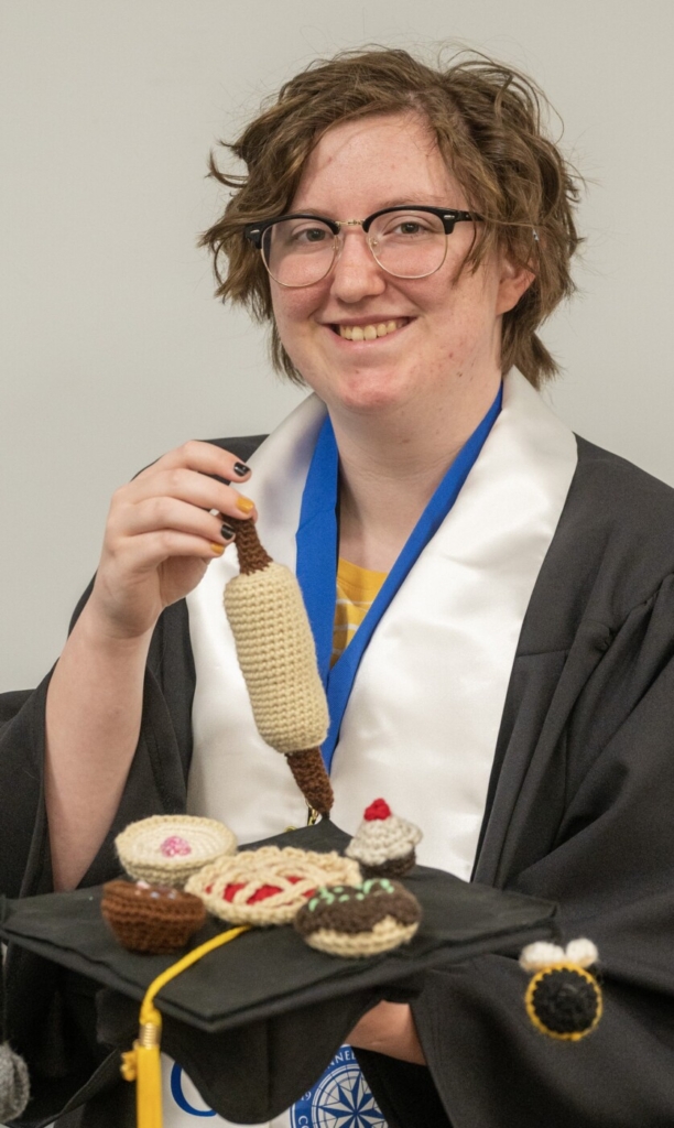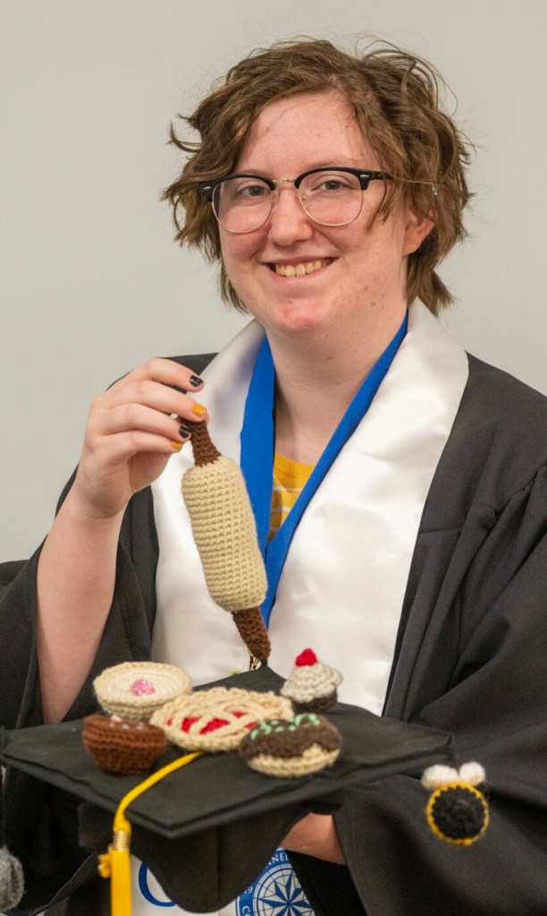 Lyric Laffin of Burnham, a graduate of the culinary arts program, had her black mortarboard decorated with food times that were crocheted by her mom, including a doughnut, cherry pie, brownie and tart. They were secured by safety pins. Laffin said she loves to bake, more so than cook, in part because baking is more scientific and precise. For her, it is less stressful than cooking.