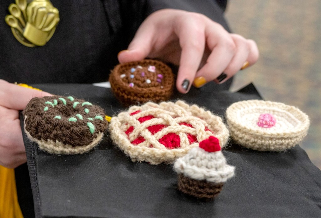 Culinary arts graduate Lyric Laffin talks Saturday about the baking-related crochet ornaments her mother made prior to the start of Kennebec Valley Community College commencement exercises at the Augusta Civic Center. Joe Phelan/Kennebec Journal