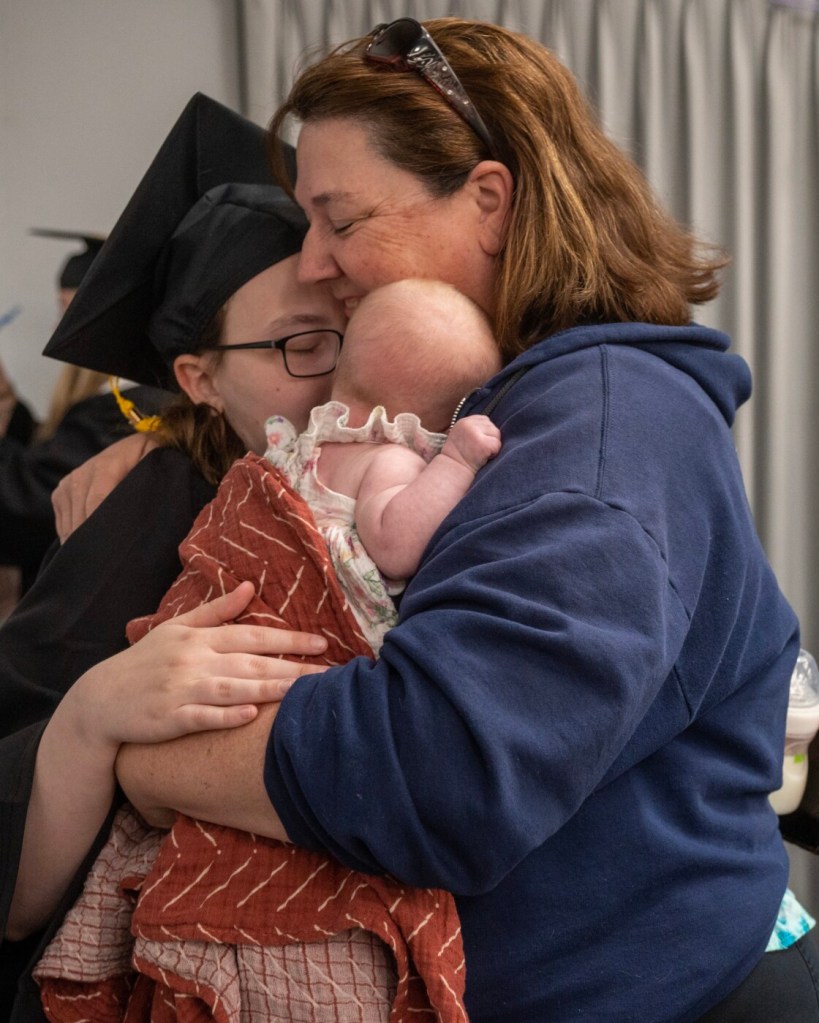 Phlebotomy program graduate Shyanne Durand, left, hugs her mother, Tina Durand, and her 2-month-old daughter, Scarlett Turner, before the Kennebec Valley Community College graduation Saturday at the Augusta Civic Center. Joe Phelan/Kennebec Journal
