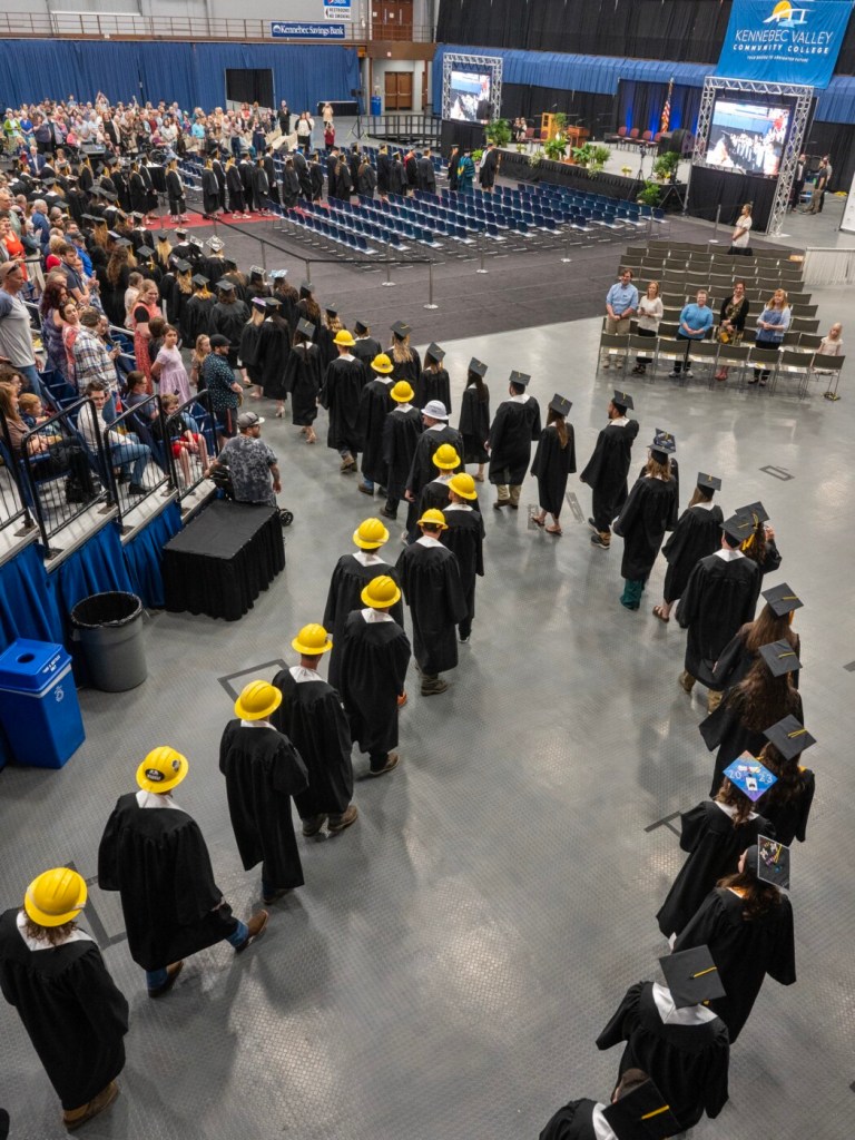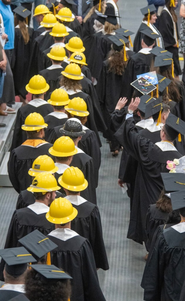 Most graduates wore traditional mortarboard caps with their graduation gowns, though roughly 20 graduates of the school’s electrical lineworker technology program marched in donning their yellow hardhats.