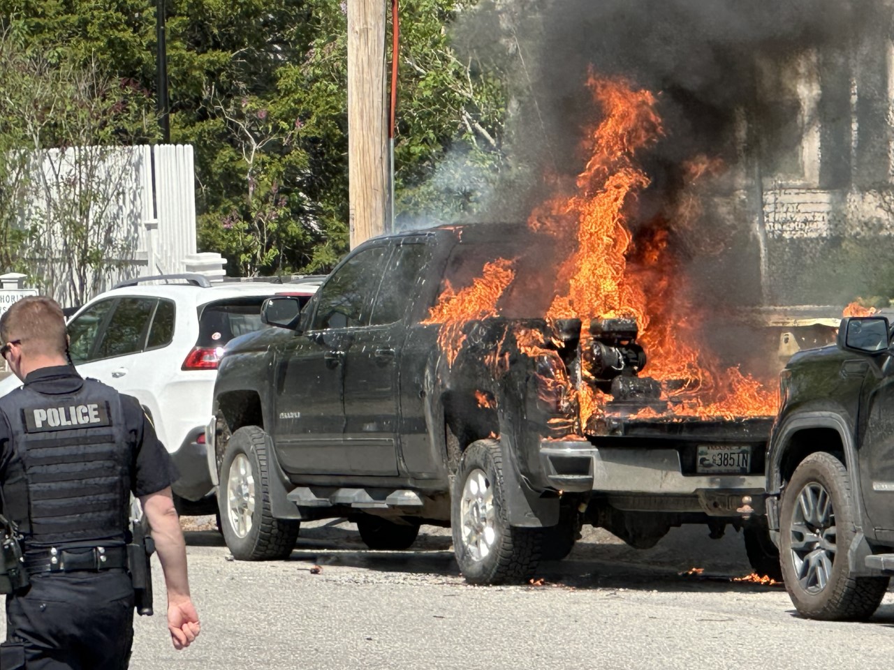 Witnesses reported seeing smoke coming from a 2015 Chevrolet Silverado before it exploded into flames around 2:30 p.m. Thursday.
