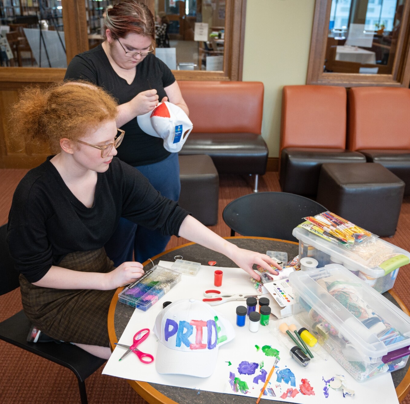 McKenzie Gay, left, and Bella Morton decorate signs and accessories Wednesday at Lithgow Public Library in Augusta. The library organized a “Make Your Own Pride Gear” event for teenagers to prepare for the Pride Portland parade and festival on Saturday. Ashley Allen/Kennebec Journal