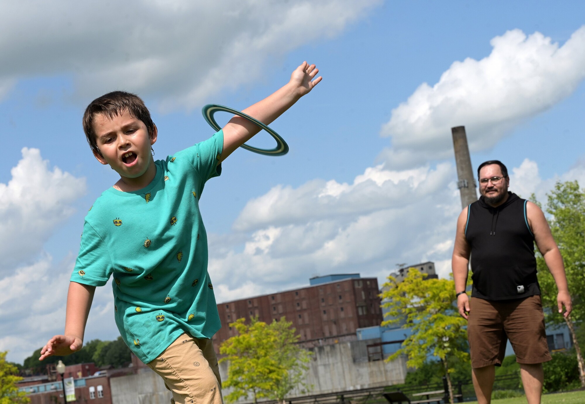 Brantley Corson, 6, of Winslow spears a frisbee with his arm while playing with his grandpa Mike Nabarowsky, right, by RiverWalk at Head of Falls in Waterville on Thursday. The pair said they were celebrating Corson’s last day of first grade, which was Thursday, by playing and getting ice cream. Rich Abrahamson/Morning Sentinel
