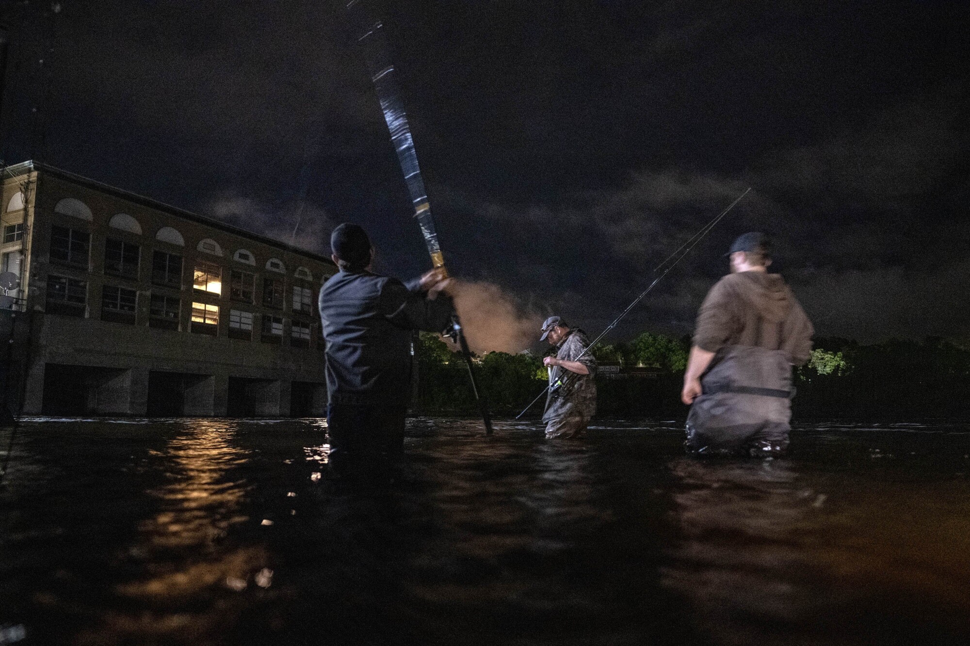 Dan McEachern, left, Chris Sanford, center, and Kevin Wickett fish for striped bass Friday, June 9, night below the Lockwood Dam on the Kennebec River in Waterville. Michael G. Seamans/Morning Sentinel