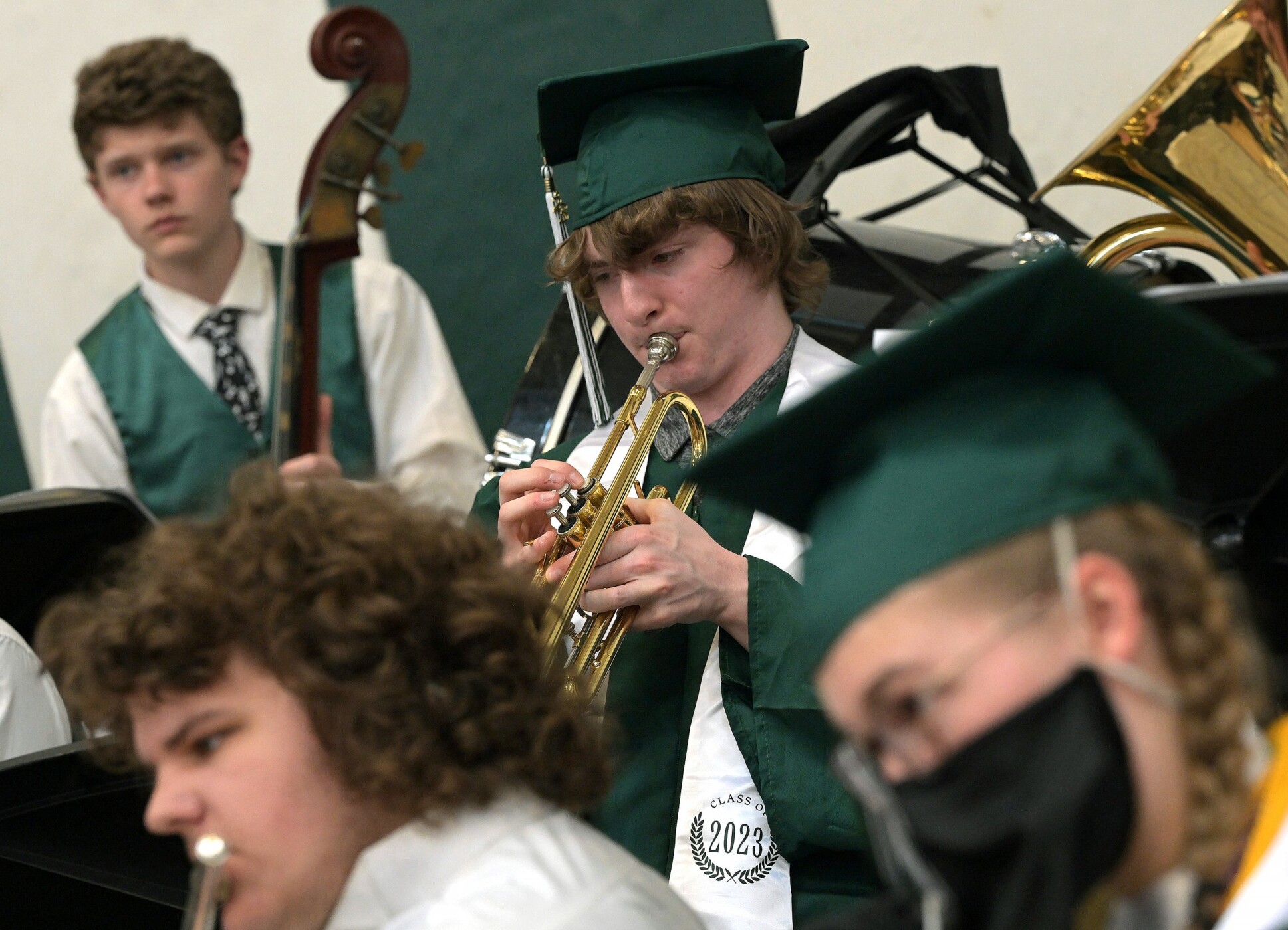 Graduate Dakota Freeman plays the trumpet with the concert band Sunday, June 11, afternoon before participating in the processional during the commencement exercises at Mount View High School in Thorndike. Rich Abrahamson/Morning Sentinel