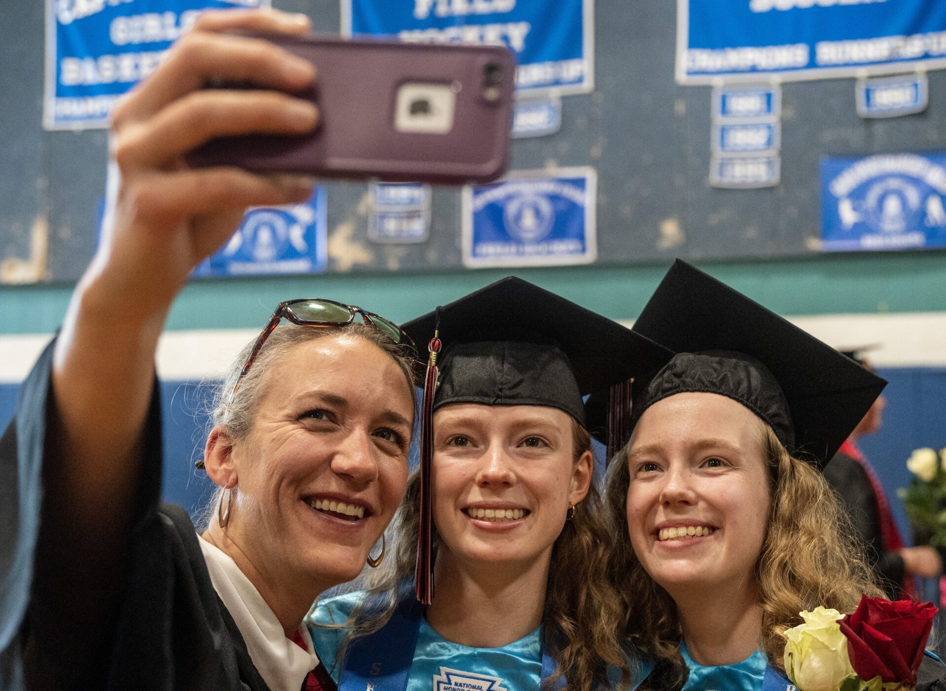Art teacher Jen Paisley, left, takes a selfie Sunday, June 11, with sisters Dorothy and Bethany Ives before the graduation ceremony at the Melville H. Simmons Complex at Hall-Dale High School in Farmingdale. Joe Phelan/Kennebec Journal