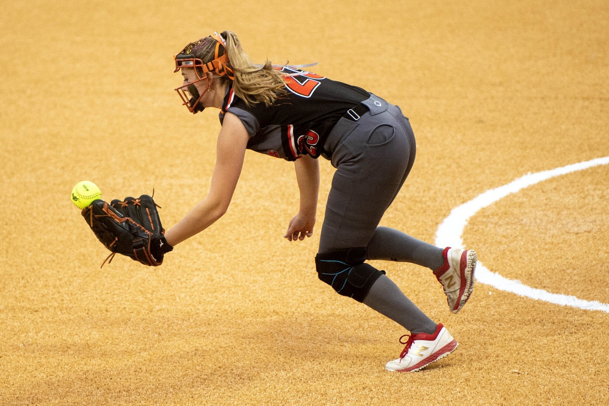 Skowhegan pitcher Lillian Noyes looks to make a play during the Class A North final Wednesday night at the University of Maine in Orono. Michael G. Seamans/Morning Sentinel
