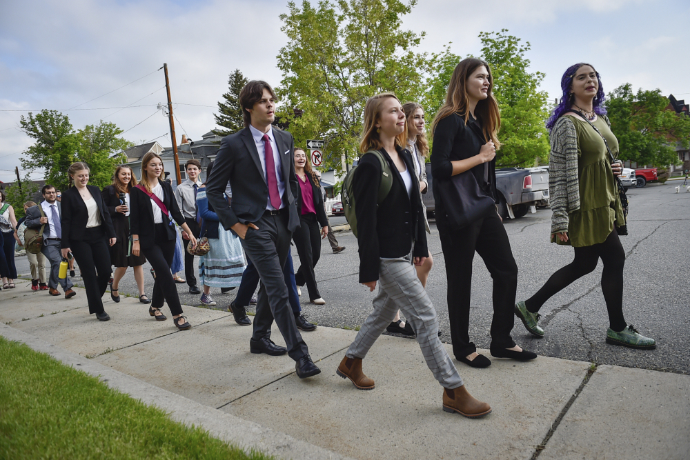 Young plaintiffs in a climate lawsuit challenging Montana’s government for not doing enough to combat climate change are seen outside the Lewis and Clark County courthouse last week in Helena, Mont. Thom Bridge/Independent Record via Associated Press
