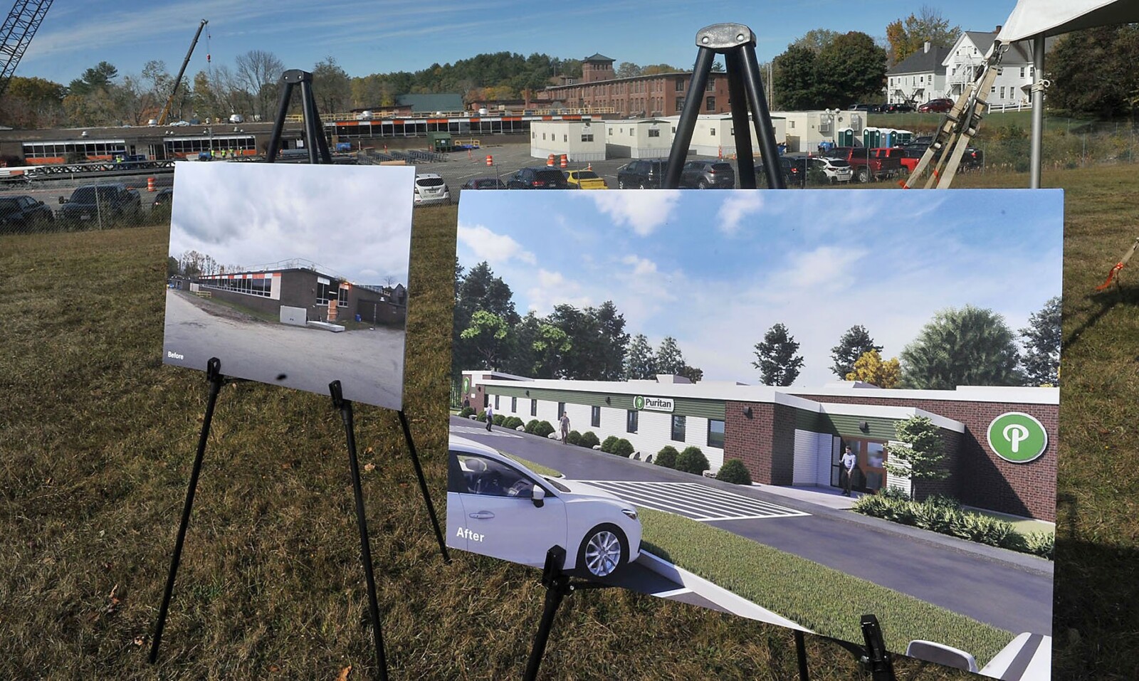 Renderings show a retrofitted Puritan Medical Products manufacturing plant in Pittsfield, left, and how a new second factory would look, right, during a reception in October 2020 announcing the building of the second factory to make medical swabs for COVID-19 testing. The production of testing swabs has fallen dramatically since the World Health Organization announced in May an end to the pandemic emergency. Puritan officials announced Wednesday that more than 200 workers in Pittsfield will be laid off. Those workers had been placed on furlough in March. Rich Abrahamson/Morning Sentinel file