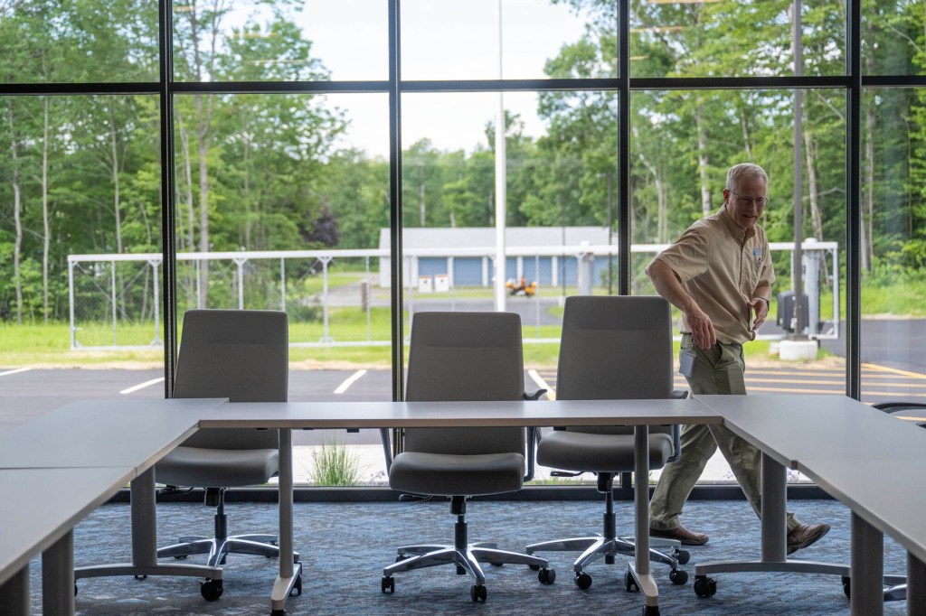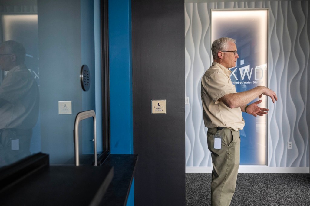 Roger Crouse, general manager of the Kennebec Water District, offers a tour Tuesday of the Kennebec Water District conference room, with the break room on the right, on Drummond Avenue in Waterville. Michael G. Seamans/Morning Sentinel