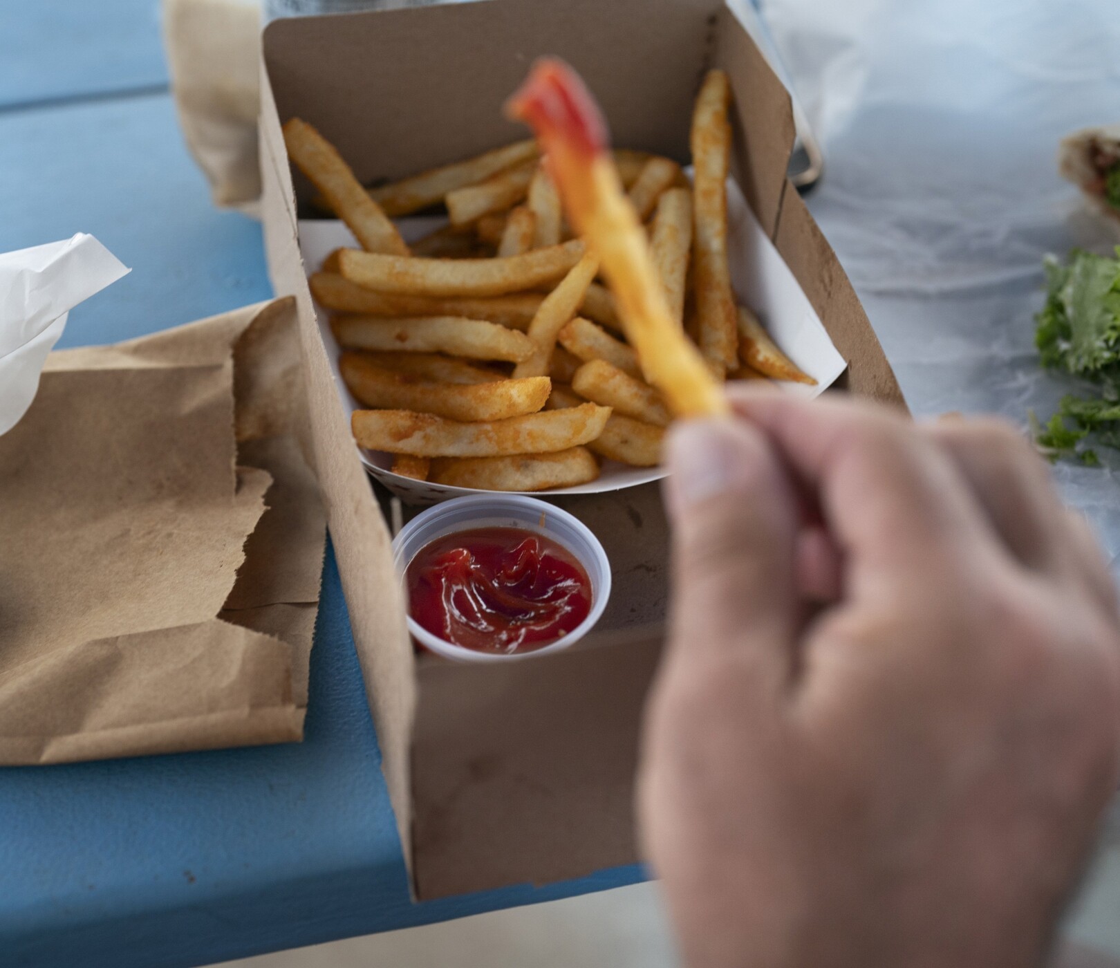 Tim Timke dips a french fry into a plastic ketchup container Friday. The container, and other single-use plastics, including utensils and straws could soon be banned under a new proposal from a group of York High School students. The Timkes, visiting Maine from New York, said they support the idea. Gregory Rec/Staff Photographer