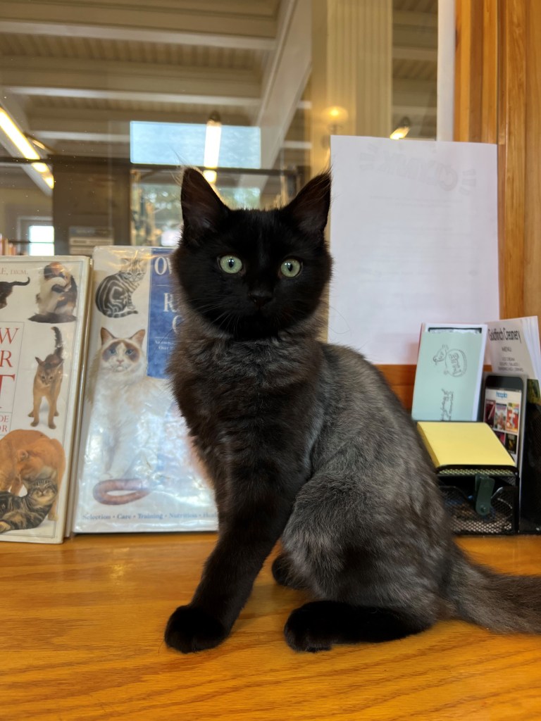 Thistle said many guests have come in excited to see the tiny, black kitten with piercing blue eyes, especially families that can’t have a cat due to allergies. Maya is kept in a tent in a section of the library so if guests have allergies, they will not have to come in contact with her.